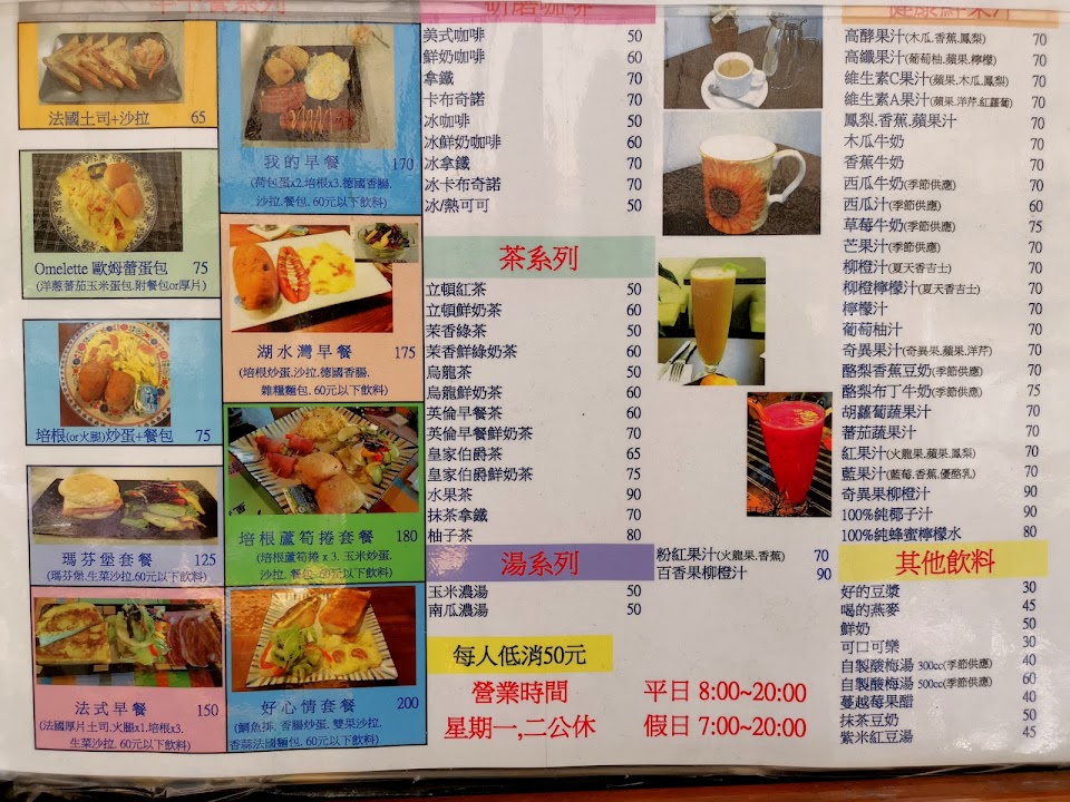常和家人到湖水灣用早餐,我們最常點的是「我的早餐」和「總匯三明治」,前者的德式香腸、培根、小麵包、奶油,品質都很好;後者的包料,例如生菜、番茄片量足又新鮮,兩個CP值都很高。