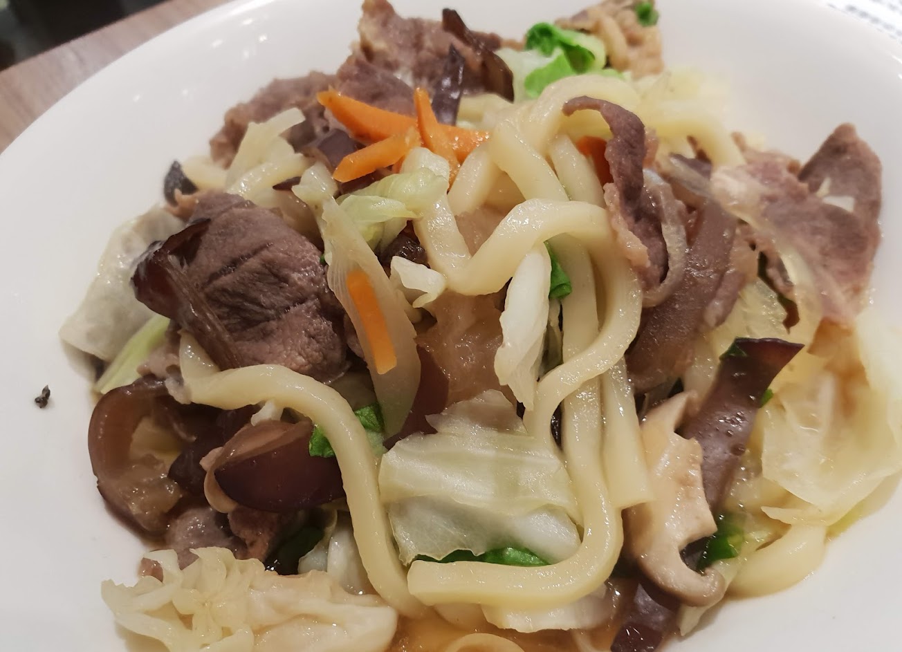 牛肉炒烏龍:本日地雷,牛肉應該是火鍋肉片那種,炒的又老又韌,口味有點偏日式壽喜燒醬的感覺,但收汁不足,點炒烏龍整碗湯湯水水的帶上來,只有烏龍麵的口感尚可,但不值這個價位。