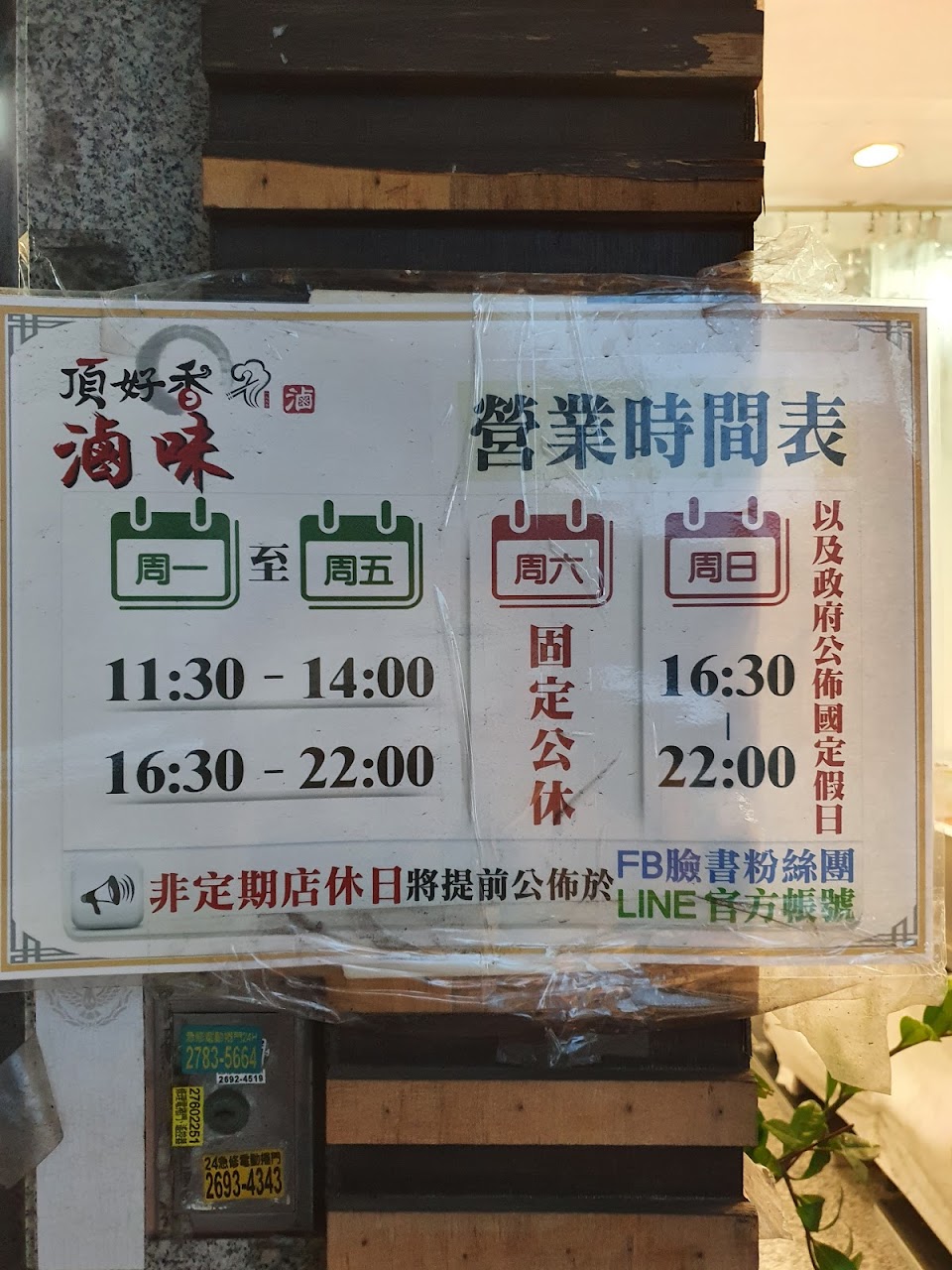 | 星期五 | 11:30–14:00 16:30–22:00 |