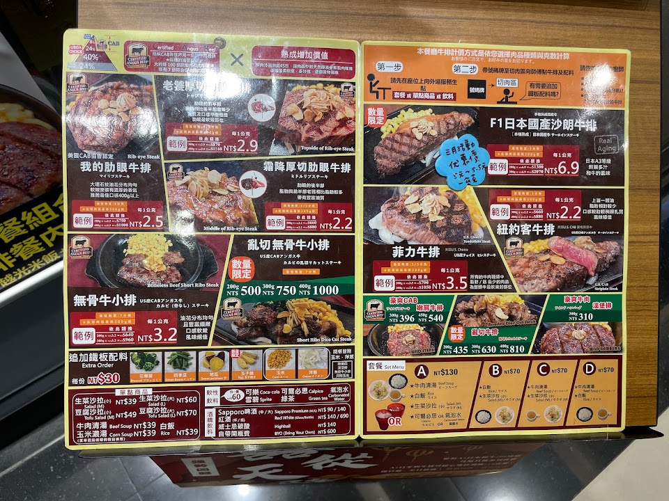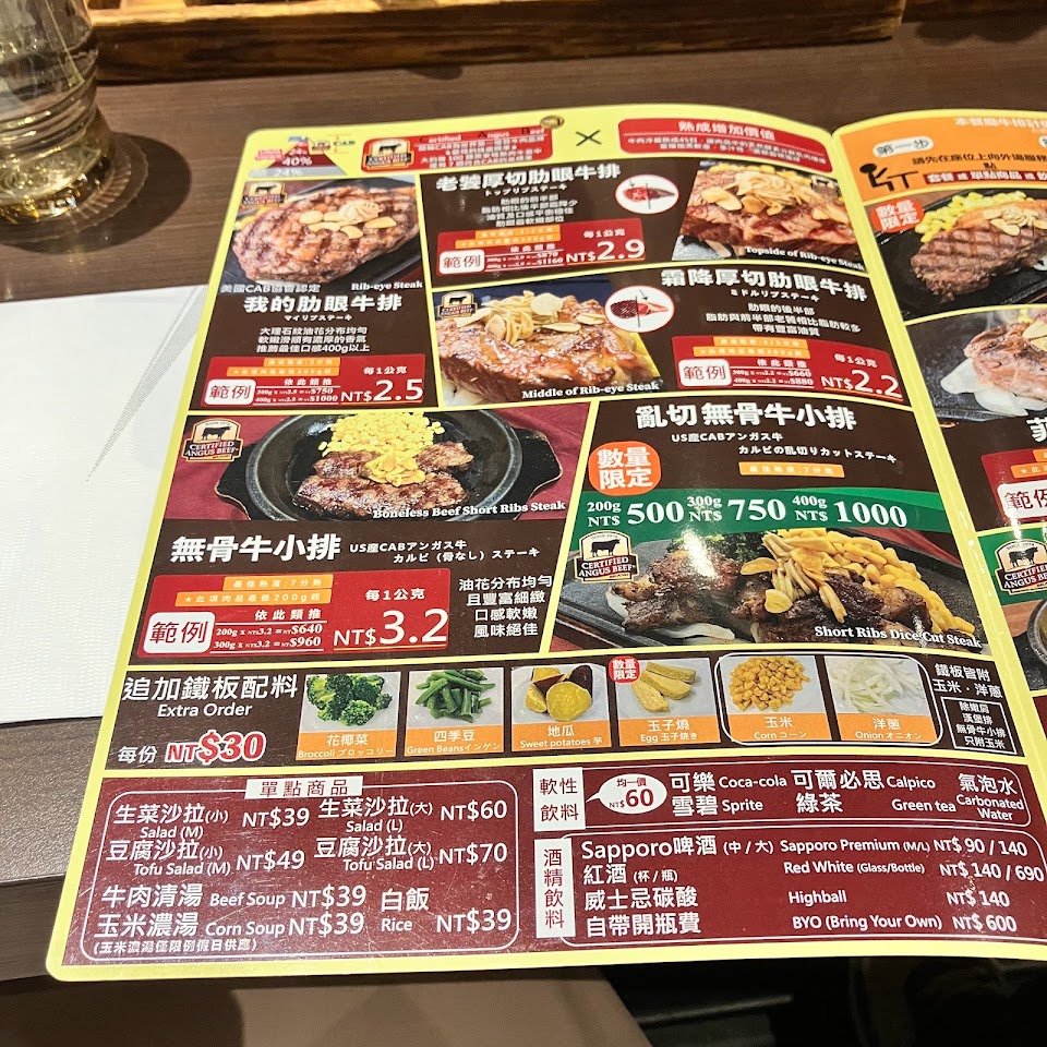 初次吃到用秤重方式來計價的牛排,一進去店員幫你帶位,決定吃什麼後再拿牌子到切肉區告訴店員要吃什麼部位跟想要幾克的重量,也會有別的店員來詢問要不要配餐,配餐有ABCD可以選,這次吃我的肋眼牛排5分熟400克,覺得很不錯吃很飽?,牛排之外還有玉米、洋蔥跟蒜片,這搭配很讚~配餐選了牛肉清湯配沙拉,想不碰碳水也可以這樣點?肉好吃也好切,沒有吃到什麼筋,店員也蠻親切的,有機會會再去吃的~~~