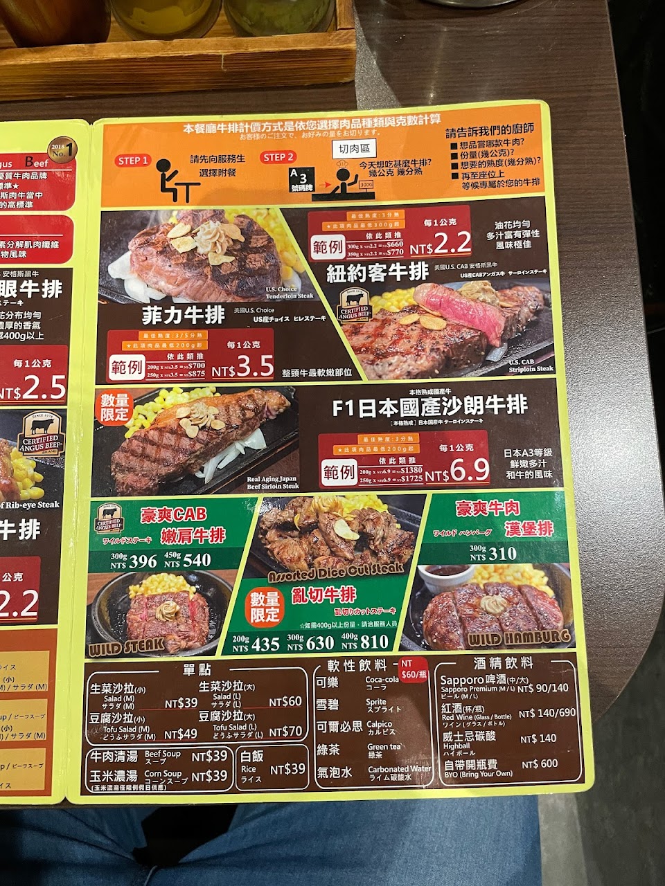 他們的晚餐是由顧客自己去決定要多重的肉品,按重量計價,午餐則是每種牛排有三種不同重量的選擇,相較之下,午餐要比晚餐划算多了,對愛吃牛排的饕客,午餐時段是個好選擇。