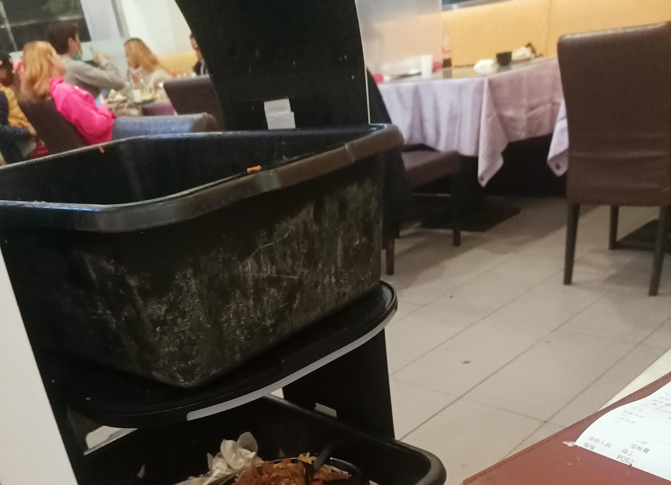 一開始做的位置椅子後面還是收垃圾廚餘跟餐盤的餐車,餐車推回來還旁邊垃圾桶直接靠在外套上