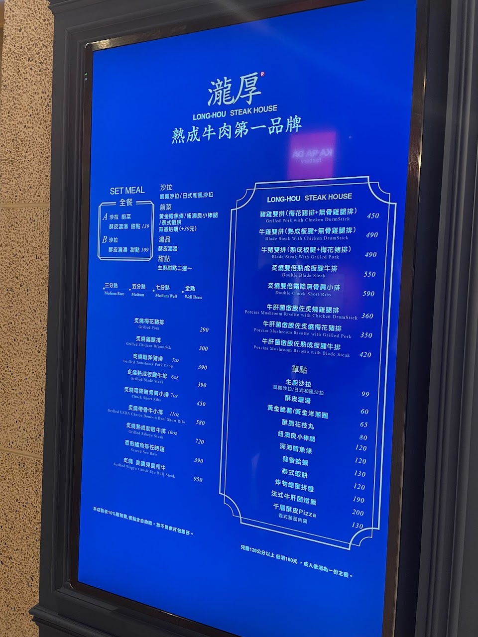 價錢算比平價再高一點,我們兩個人,1個人加A套餐,另一人單點,又單點一份薯條,含服務費1200元左右,不算太平價,但整體算好吃,肩小排五分熟,略帶血的口感算嫩口,豬肋排吃起了像叉燒,尚可湯品跟飲料都可自助到飽;但個人(因素)不會再回訪,因為小孩真的太多了,整間餐廳有七成來客都攜家帶眷,座位窄小又相鄰、隔板又矮,時不時隔壁桌的小孩不是探頭盯著你,不然就是猛敲隔板,個人覺得用餐品質不佳,所以這樣適合全家大小的餐廳就讓給family 吧。