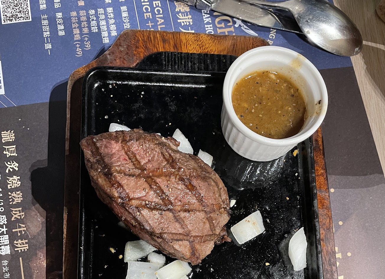 我點的是菲力3分熟,但大概是鐵板太燙了吧,上桌後約5分小小可惜,以這個價位感覺菲力應該要再表現得更好一點,肉本身沒有很好吃🥲