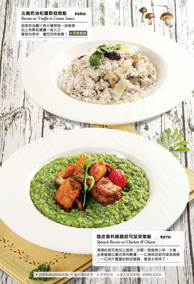 青醬雞腿總匯烤飯 青醬燻雞烤餅 230 海陸總匯披薩 轟炸雞歐姆蛋烤飯 比利時水果麻糬鬆餅 雙人下午茶套餐 丁骨豬排佐炭烤魷魚 主廚濃湯 南瓜濃湯