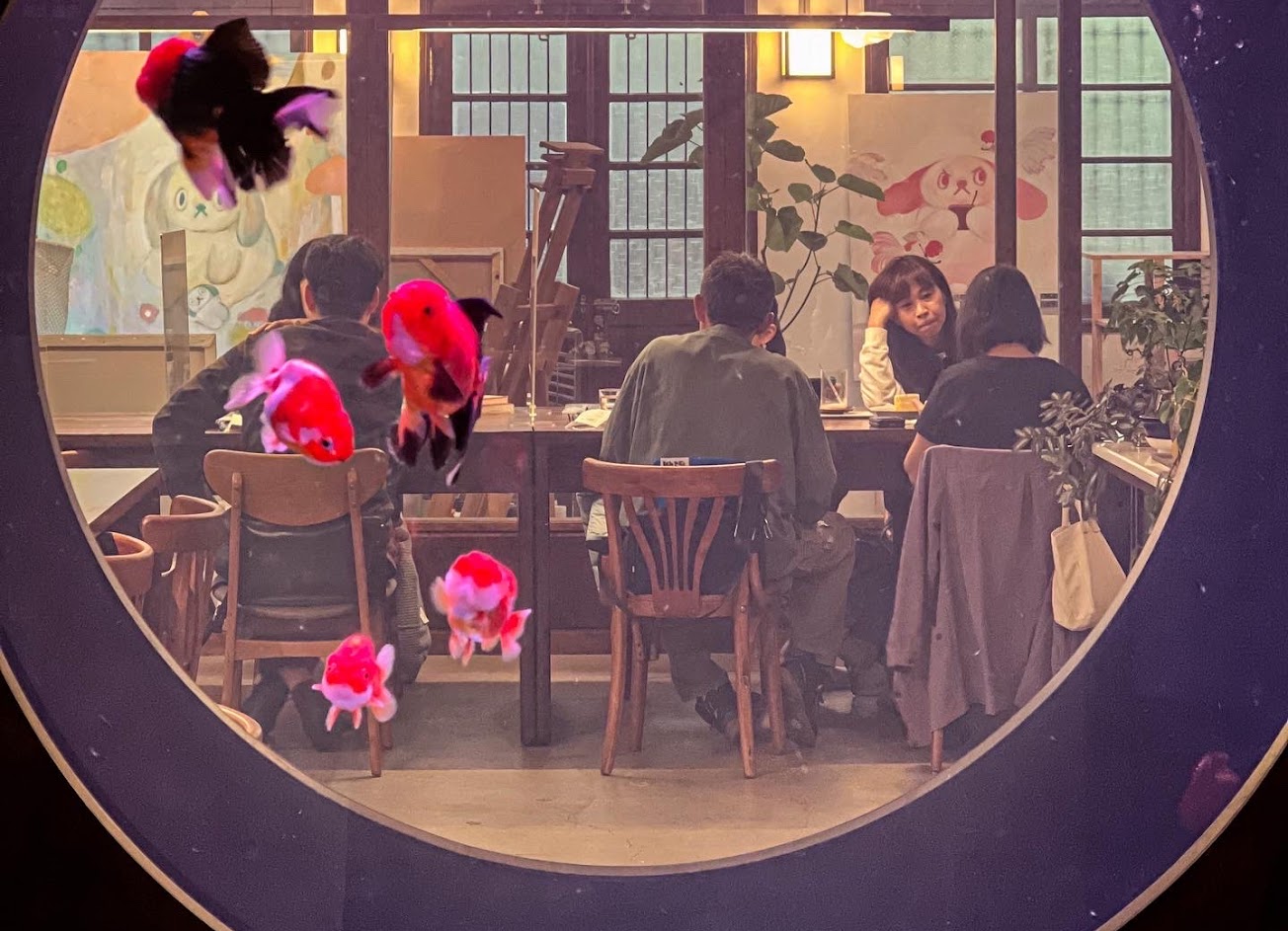 總之,是一間細節很多的咖啡室。從門外,到進門,會先看到右手邊充滿美麗顏色組成的吸菸室之門,左手邊則是獨立出來的小櫃檯空間。再往前幾小步,會看見整間店的靈魂之窗(?)——可以隔著窺視店內的大魚缸,非常療癒。