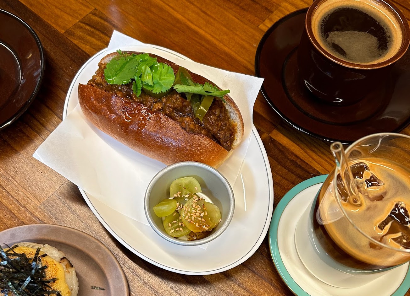 咖啡店設有兩長桌,座位二十席;提供乾咖哩熱狗麵包、炒麵麵包、明太子烤飯糰等日系風味輕食,飲料以咖啡及茶類為主,有燕麥奶選項,杯盤雅緻、食物可口。