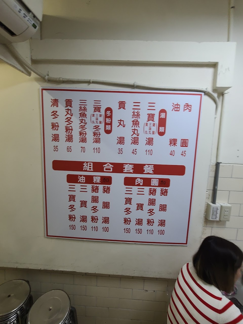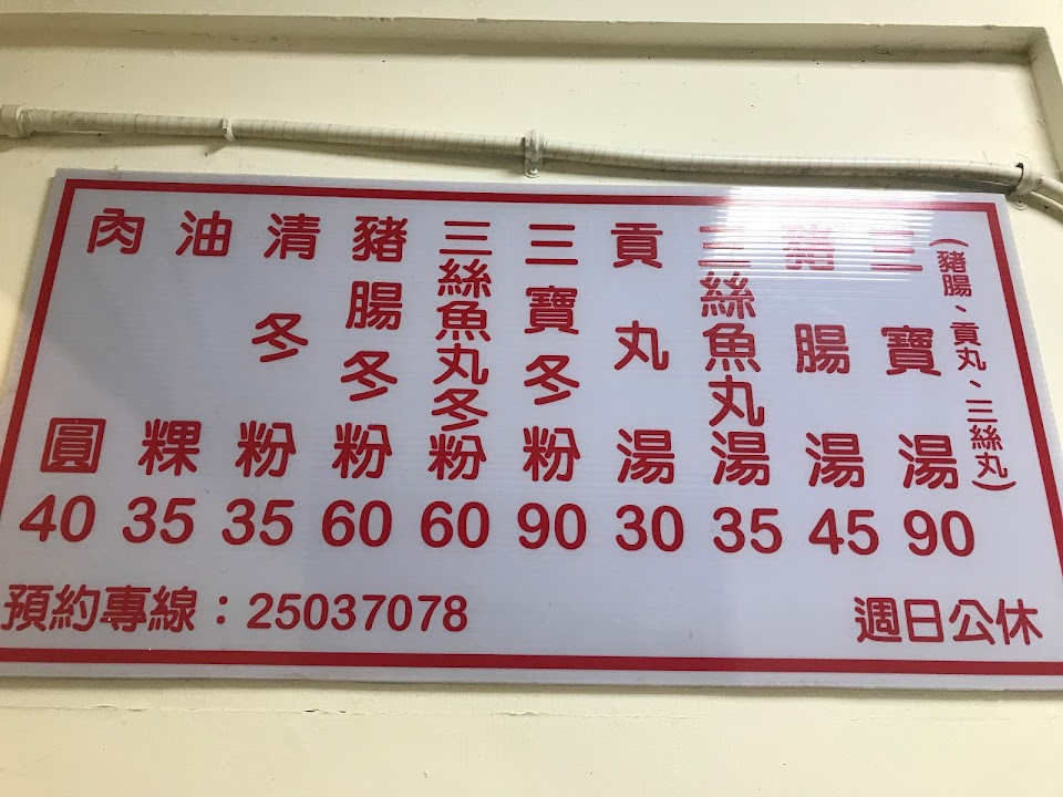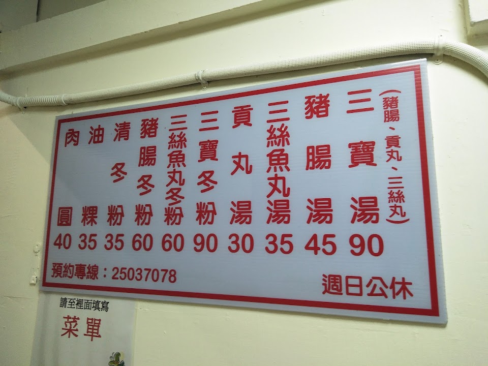 老闆個性古怪,點了三寶說沒有,問還有剩什麼回覆說剩貢丸及魚丸;後來一個客人來點豬腸冬粉反而沒被告知沒有了,我反問老闆不是沒有豬腸了嗎?他很大聲的說「我是跟你說三寶沒有了」;我他媽的就好奇了三寶不就是豬腸、貢丸及魚丸嗎?邏輯有障礙