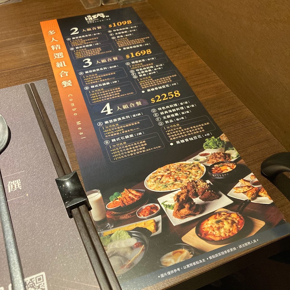 綜合海鮮餅(薄)好吃,炒春雞不錯吃,海陸豆腐煲偏鹹,石鍋拌飯好吃,燒鍋巴的溫度適中不焦,但油抹太少很難起鍋,小菜口味還不錯,可續加,海苔片好吃,可續加,飲料及甜點都普普,服務人員部分親切,部分板著臉,價格合理,足份量的雙人套餐消費1252元。