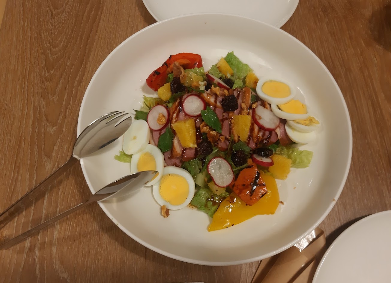 烤雞料理的時間蠻久的,但等待是值得的,上菜時是熱騰騰又鮮甜多汁的雞肉! 燻鮭魚沙拉配色繽紛、新鮮好吃,是很棒的前菜。 另外開幕活動是打卡就送松露薯條!