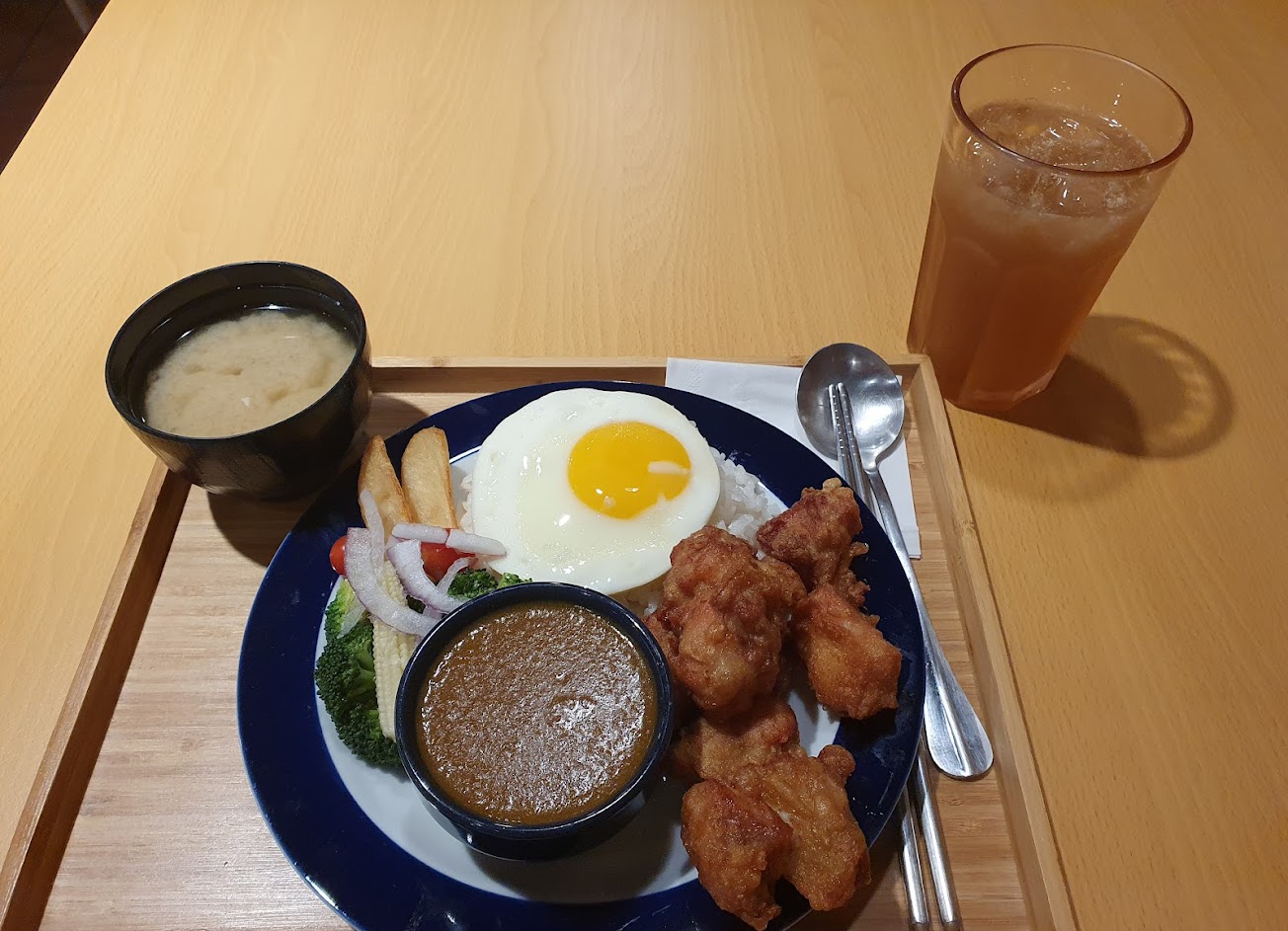 環境很棒,店員親切,咖哩的造型很好看。味道的話有點普通,但不會不好吃,一開始的量有點少不過可以免費加飯加咖哩醬。我們還單點唐揚雞跟地瓜拼盤,分別都是50塊,數量都是五個,說實話覺得量有點少,但是地瓜拼盤好吃,唐揚雞個人不喜歡皮太厚的