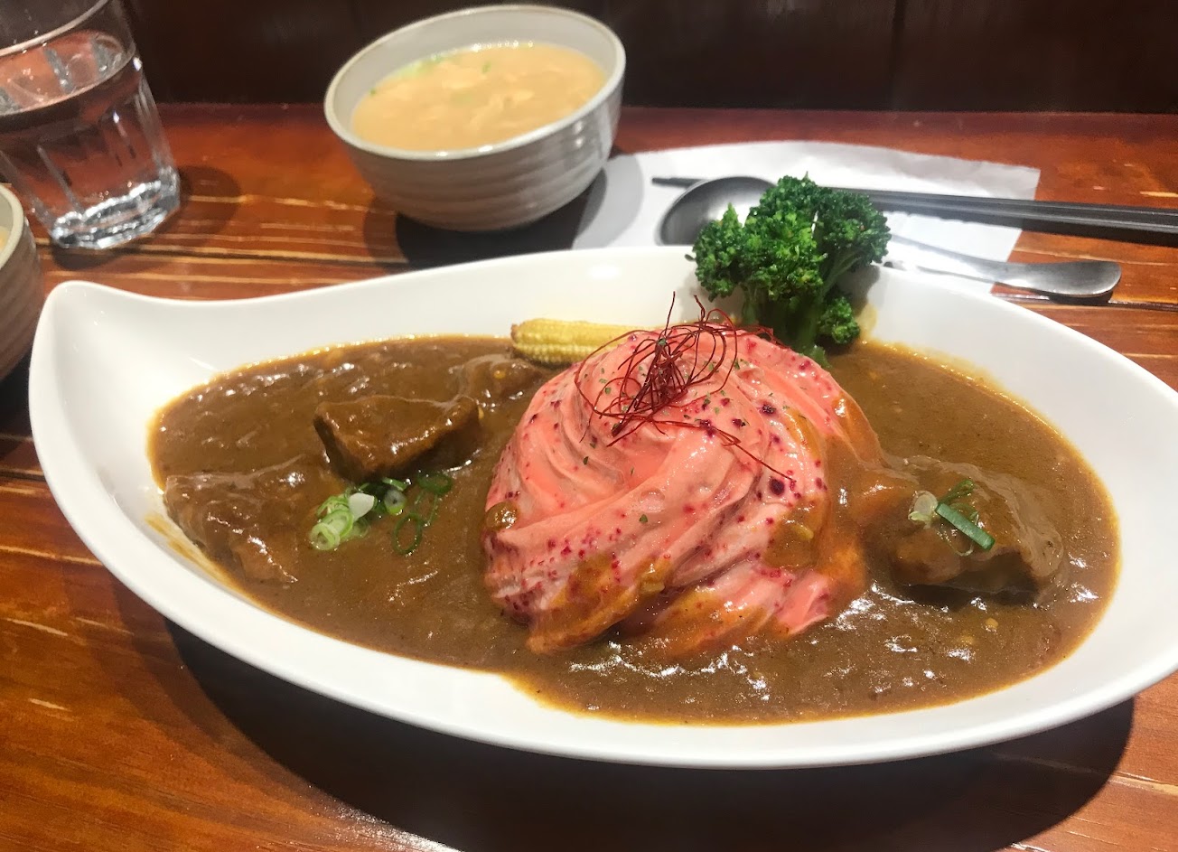 點的是今日特製咖喱:橙花咖喱,甲殼海鮮味吃得到,還帶點奶味,個人挺喜歡的?? 雞肉的部分比較一般,但無傷大雅,咖喱好吃?融入火龍果調味的歐姆蛋很美,但味道沒有紅龍果就是了,屬於視覺體驗!