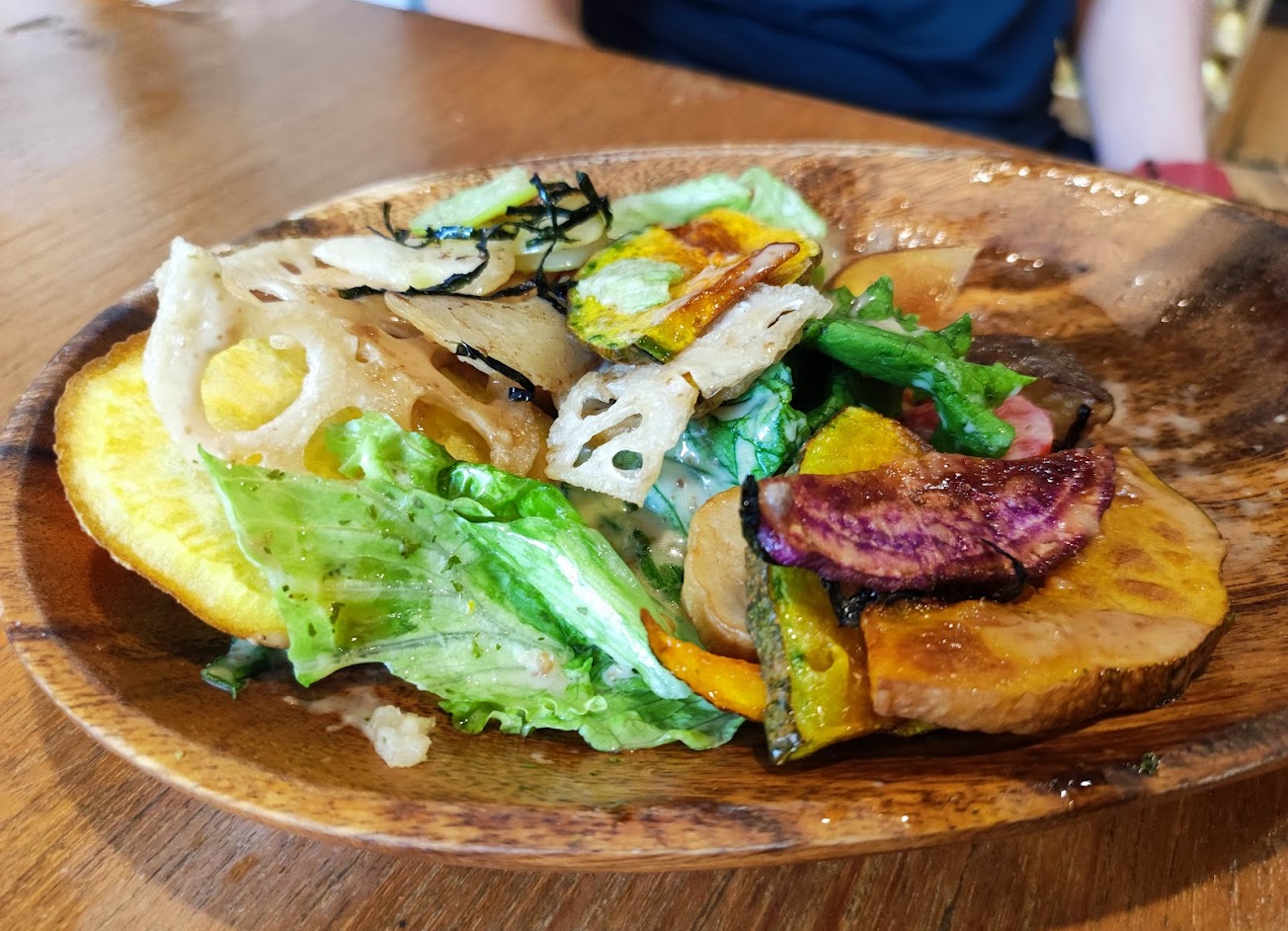 咖哩旁邊有很多炸蔬菜,茄子、杏鮑菇、地瓜等等,吃咖哩還有不是生菜的蔬菜真的很讚(´;ω;`)咖哩醬有微辣跟甜的兩種,都吃起來很有層次,還可以免費加飯加醬一次!!