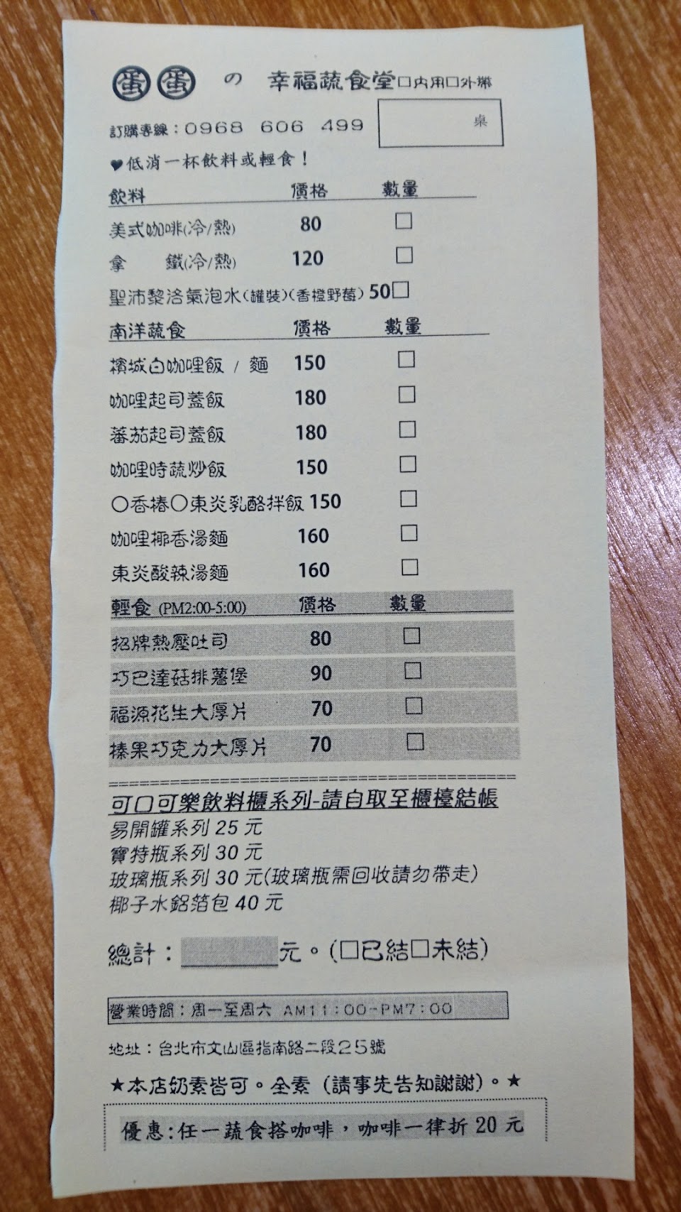 今天是第一次來用餐,我吃咖哩粿條,份量剛好,蔬菜量足,整體的口味來說,我還蠻喜歡的,推薦在文山區,吃蔬食的朋友們可以來用餐喔