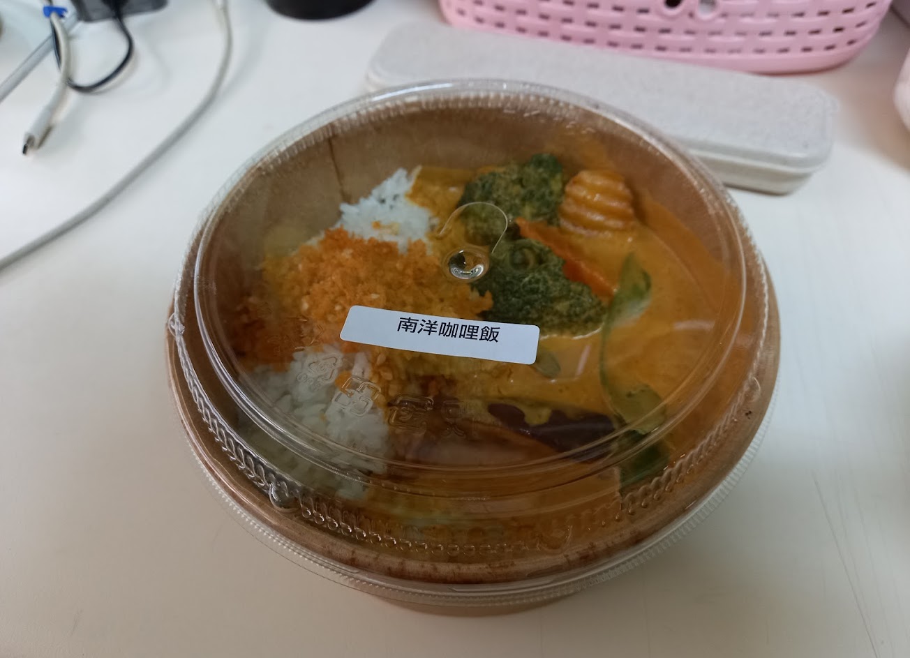 這次吃的是南洋咖哩飯,濃稠的咖哩醬是由老闆娘特調熬製而成,小辣中充斥著濃郁的椰奶香氣,白飯份量多,馬鈴薯也是給得又大又多,其他配菜主要為茄子、紅蘿蔔、荷蘭豆,唯一美中不足的是少了一些蛋白質食物。