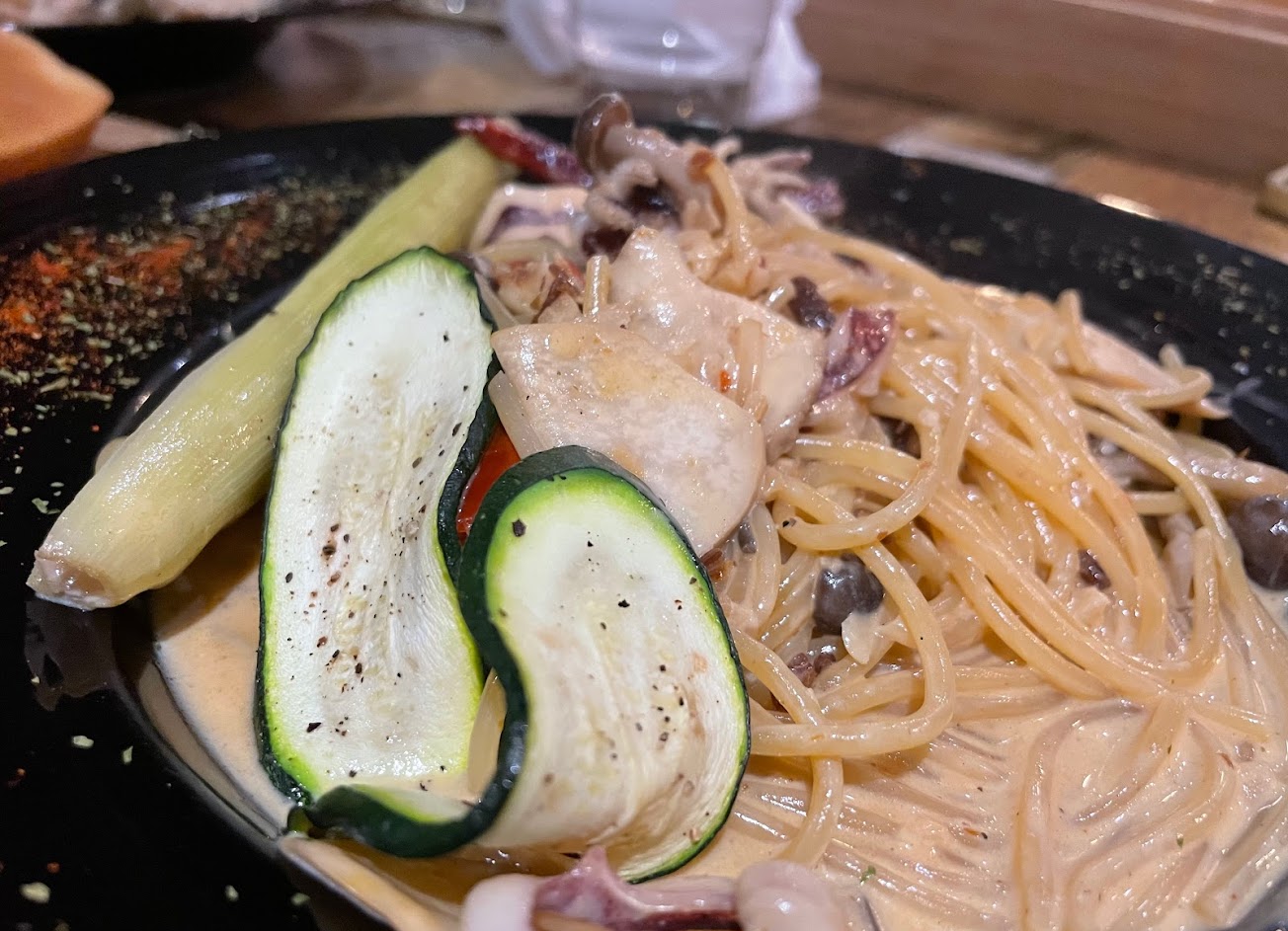 – 蒜辣海王義大利麵 $280 ?????:這是我最喜歡的一道~義大利麵麵體的口感分明,完全不軟爛,一入口蒜炒的香氣逼人,搭配一點辣度作點綴可說是畫龍點睛,野菇和櫛瓜也讓整體口味更加清爽有層次。最讓我驚豔的是透抽的新鮮度,非常軟嫩有彈性,超級好吃。