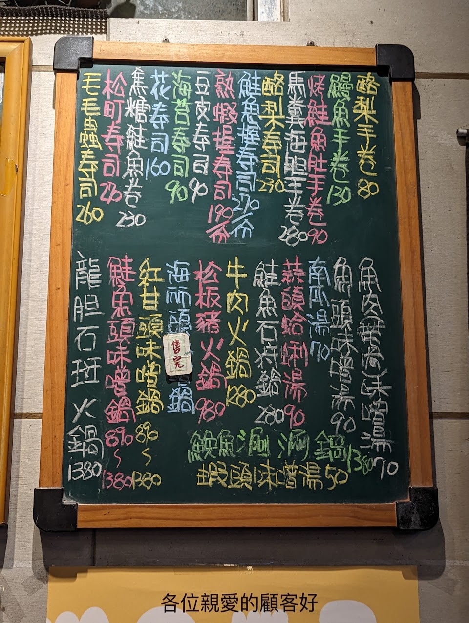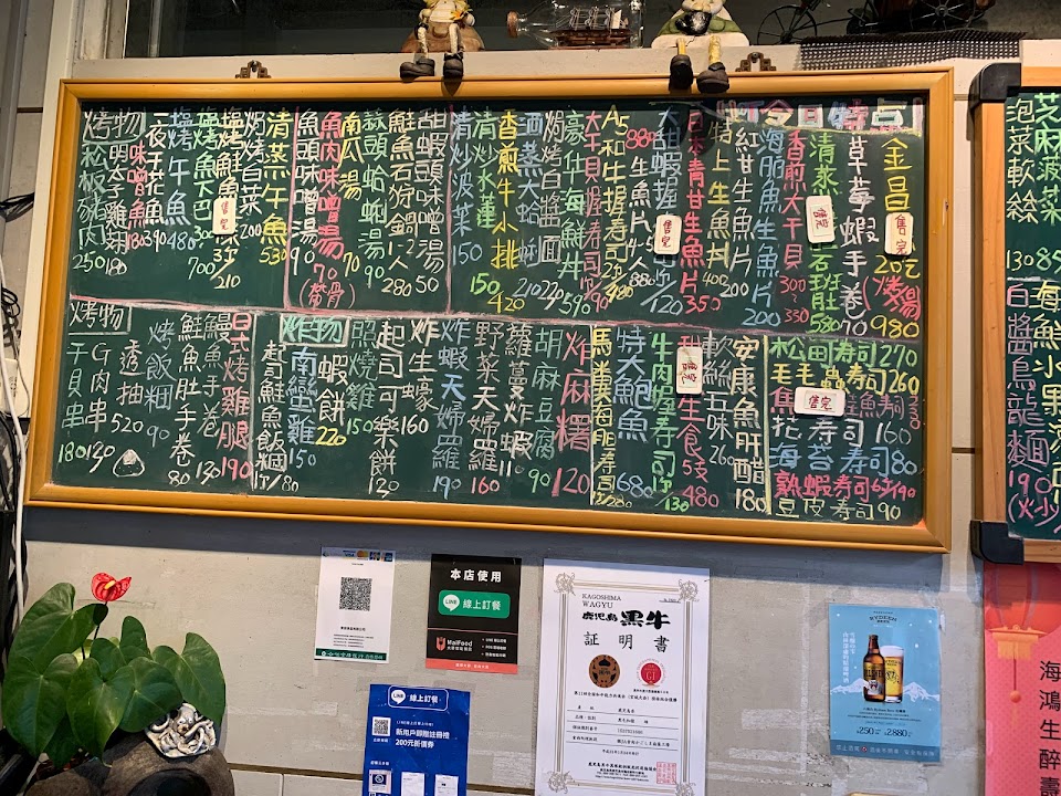 木柵在地已久的日本料理,滿滿的手寫黑板菜單,收5%服務費,可刷卡,不用擔心現金不足。毛毛蟲壽司絕對是經典菜色,微炙燒鮭魚捲搭配莫札瑞拉起司,相當美味、南瓜湯濃郁又大碗,絕對料好實在、生魚片三種魚滿滿七大片,超級滿足!推薦大家來享用