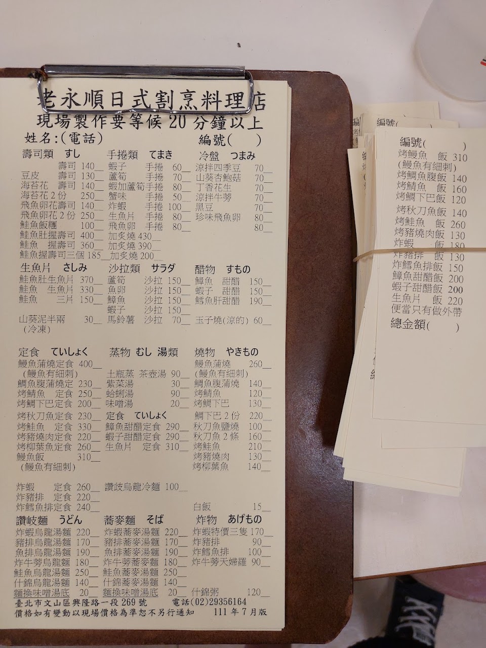 老永順是文山區在地的老店,本來位於景華公園對面,後來搬家往萬隆附近開店,老店有老店的堅持,料實在好吃,生魚片新鮮好吃,最近因應疫情關係,只賣鮭魚生魚片(暫時,也是為了保持食物的鮮度),老闆做的小菜都很下飯,是一家用心經營的日本料理餐廳。
