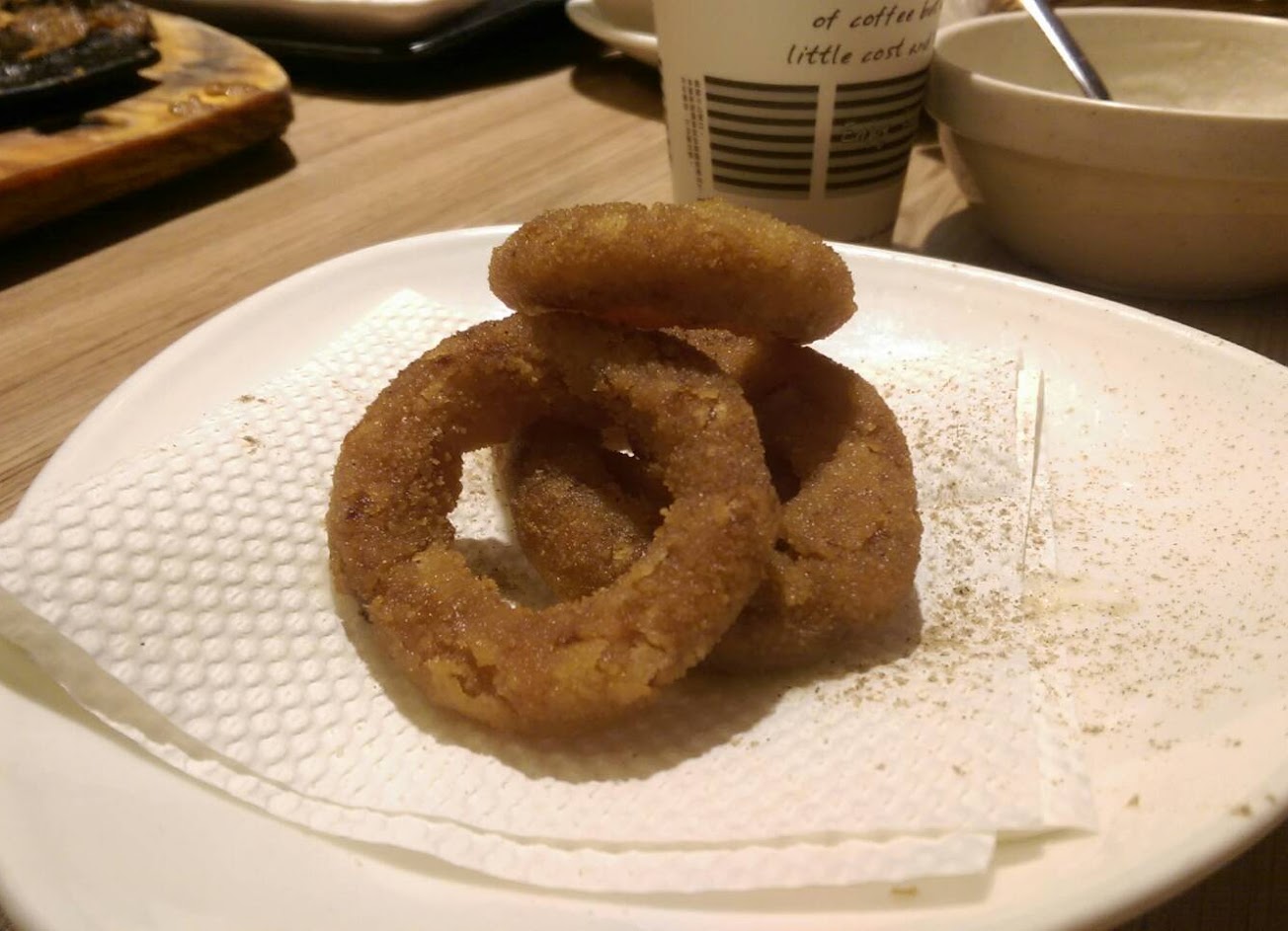 有著火鍋店裝潢的牛排店,不美味但吃得飽。飲料部分有奶茶、紅茶、蜂蜜水、仙草和玉米湯,且有白吐司和蒜吐司可以拿取,配有草莓果醬和巧克力醬。主餐方面覺得平價、口味普通,對使用回鍋油炸的洋蔥圈很失望,照片中可以看到不是因為拍不好,而是真的就是那個顏色。
