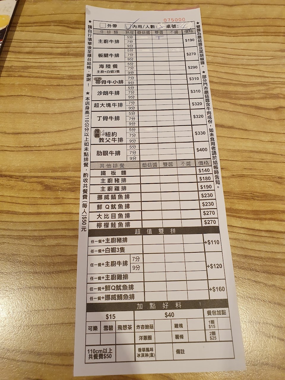 用餐方式,帶位-點餐畫單子-櫃檯買單
