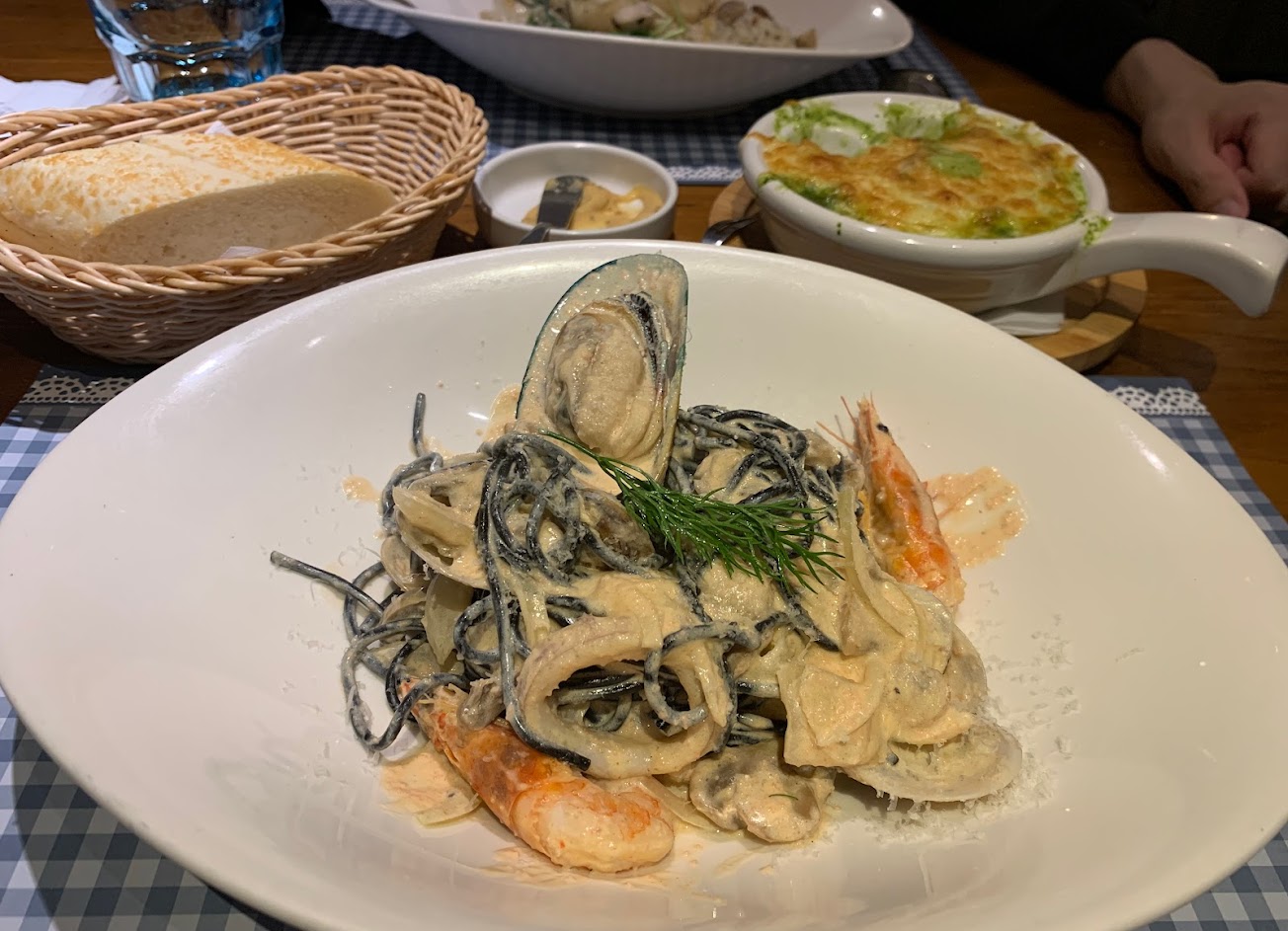 初訪~ 整間是個CP值很高的義式餐館~ 海鮮墨魚麵,海鮮超多鮮甜好吃;奶油干貝燉飯好入味,干貝超級大顆、蔬菜種類也很多,非常推薦!