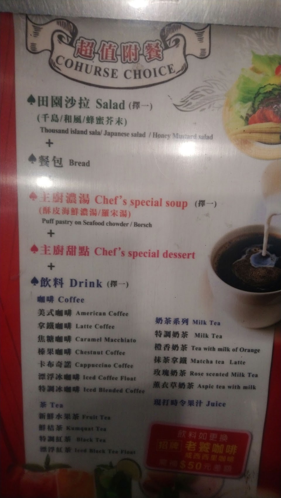 牛排套餐有附玉米濃湯和冰紅茶,另外點了熱卡布和老饕冰咖啡香濃可口,為這一餐畫下完美的句點,不枉費想念了二年,特地搭計程車來用餐。