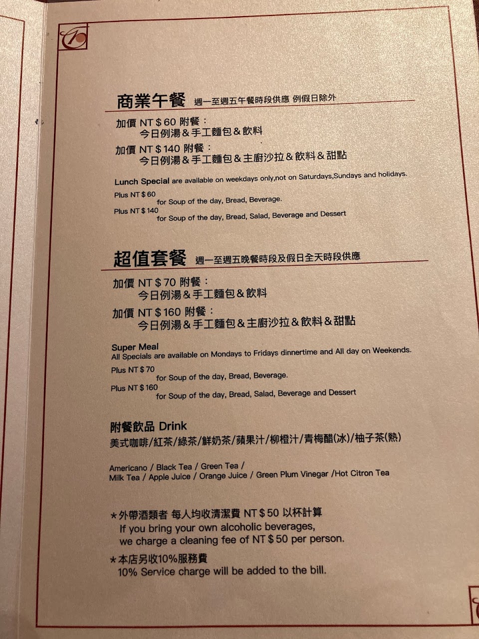 午餐加套餐120,晚餐與假日加套餐是140,內含麵包、湯、沙拉、飲料、甜點。半套套餐則是加60元,內含麵包、湯、飲料。