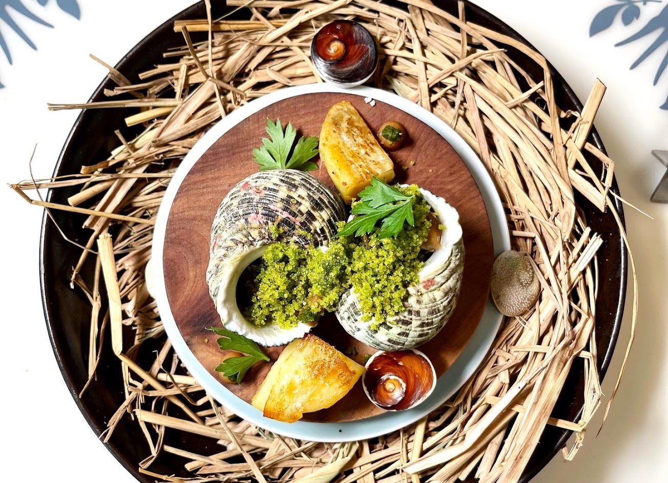 用台灣產的「月光螺」取代法國進口田螺做的烤田螺,是把月光螺用蒜油低溫烹調再填回螺裡,搭配加了巴西里打成的麵包末、焦化洋蔥醬,口味略鹹,但口感極佳,比法式田螺有更濃郁的鮮味。