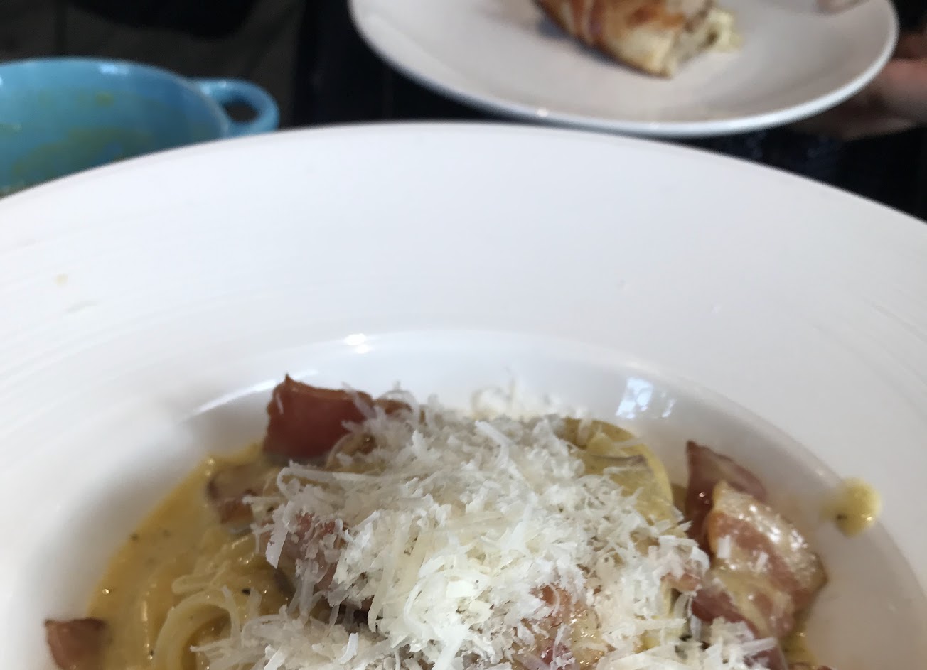 義大利經典菜色的淡黃培根麵也表演優異,這款畢竟需要趁熱吃外帶多少會有點沾黏,有機會一定要內用品嚐看看!農園但不厚重的醬汁,配上鹹度適中給的大方的培根,可以每一口都感受到兩者的相輔相成。