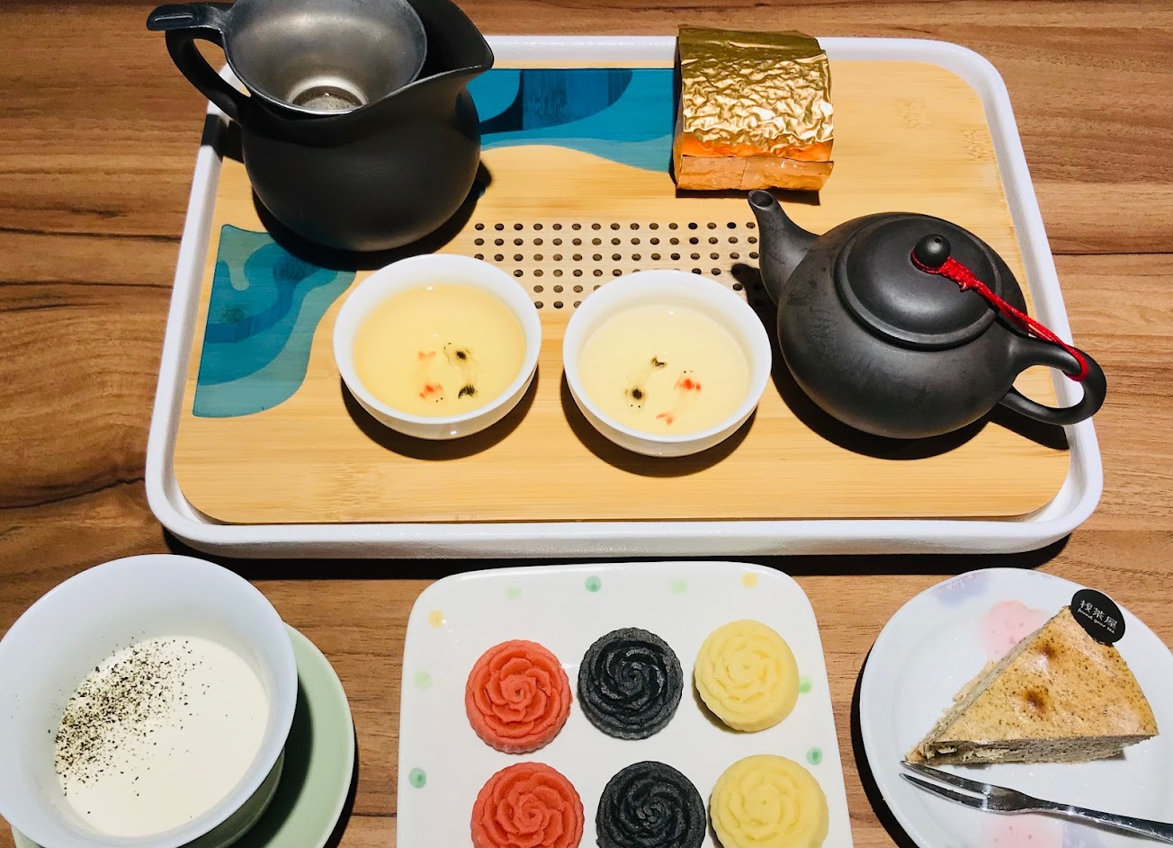 最讓我驚艷的是飯後的茶點,尤其是鐵觀音乳酪蛋糕,吃得到滿滿茶香,綿密卻又不甜膩,搭配高山金萱茶,一口茶一口蛋糕,根本就是理所當然的絕佳組合,先頒給了鐵觀音乳酪蛋糕為今日的第一名。撒著淡淡茶粉的鐵觀音奶酪口感軟嫩,看得到奶酪有著一點一點的黑色小顆粒,是用香草莢下去用心製作的,而不是香草精,這個肯定要先給80分的吧!滑順的奶香搭配著鐵觀音的清新,榮登了今日我心中的第二名。冰心三色綠豆糕,口感紮實細膩,有著入口即化的口感,最喜歡的是有著淡淡花香的玫瑰口味,而對於我這種沒有泡過茶想體驗看看的客人,店員也非常認真親切的說明茶的特色,以及該怎麼沖泡才能帶出茶的風味,茶香濃厚甘醇,多次回沖了,還是有著金黃透明的琥珀色澤。