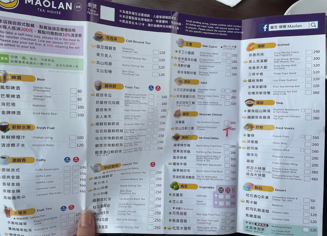 金字塔茶炒飯很好吃,是沒有吃過的味道很新鮮,除了裡面有一根頭髮之外整體都很好,炒空心菜很好吃,蒜味調得剛剛好,鐵板牛柳跟蜜香排骨我個人不喜歡,因為我不能接受鹹食裡面有太多甜味,但朋友點的他喜歡,鐵觀音冷泡茶真的必點!茶果然是貓空特產,真的很好喝!