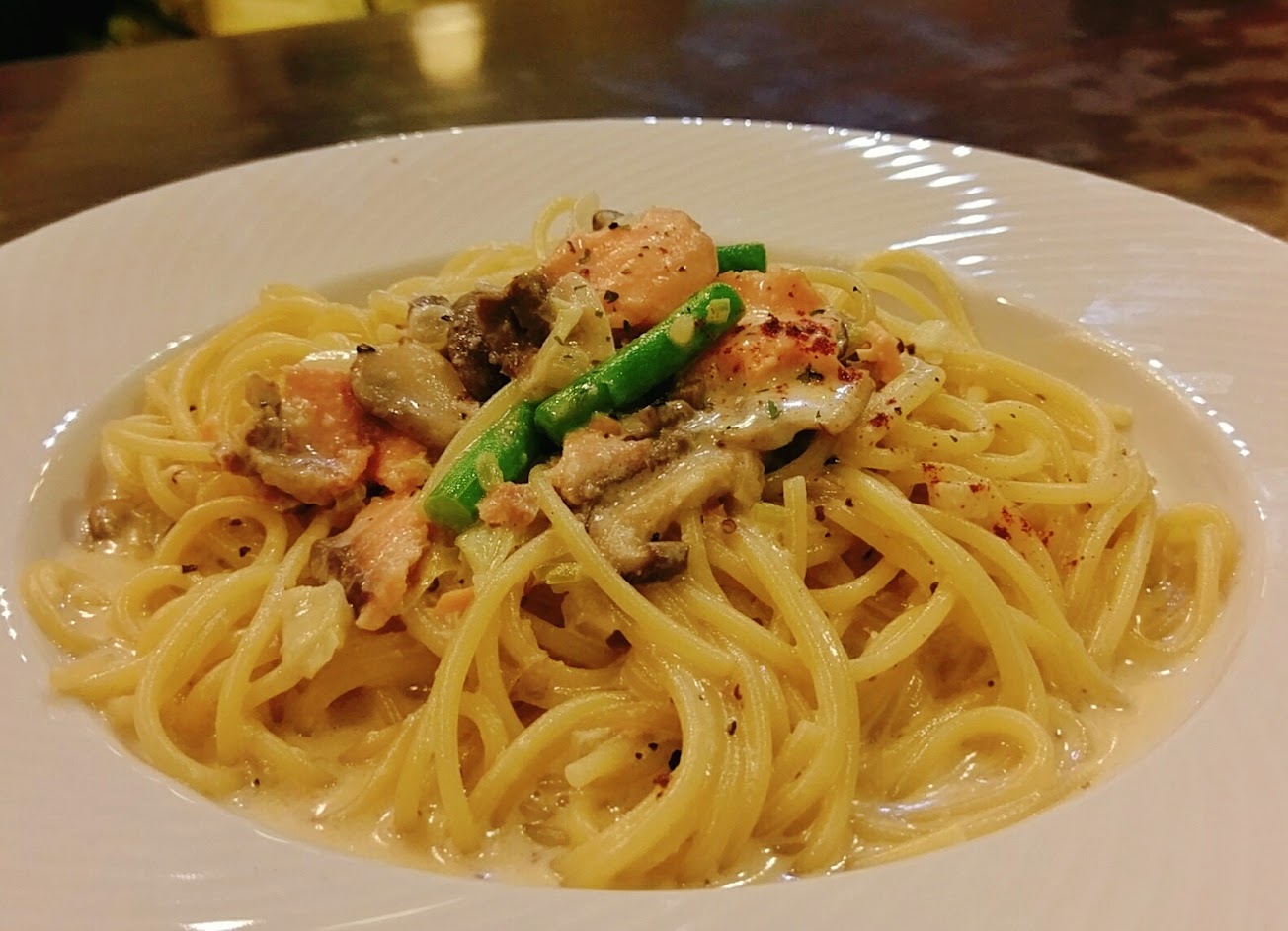 招牌的奶油煙燻鮭魚義大利麵,上面的鮭魚、香菇、四季豆,搭配濃厚的奶油醬!超好吃!