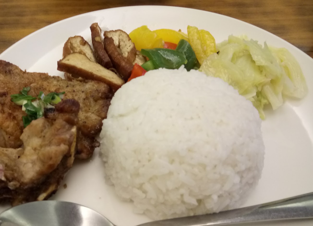 烤豬肉飯($100),三配菜一主菜,配菜味道滿不錯的,但是口味分不出跟臺式有何不同,只有飯明顯跟臺灣不一樣,烤豬肉很普通吃不大出特色,朋友的香茅排骨就好多了。