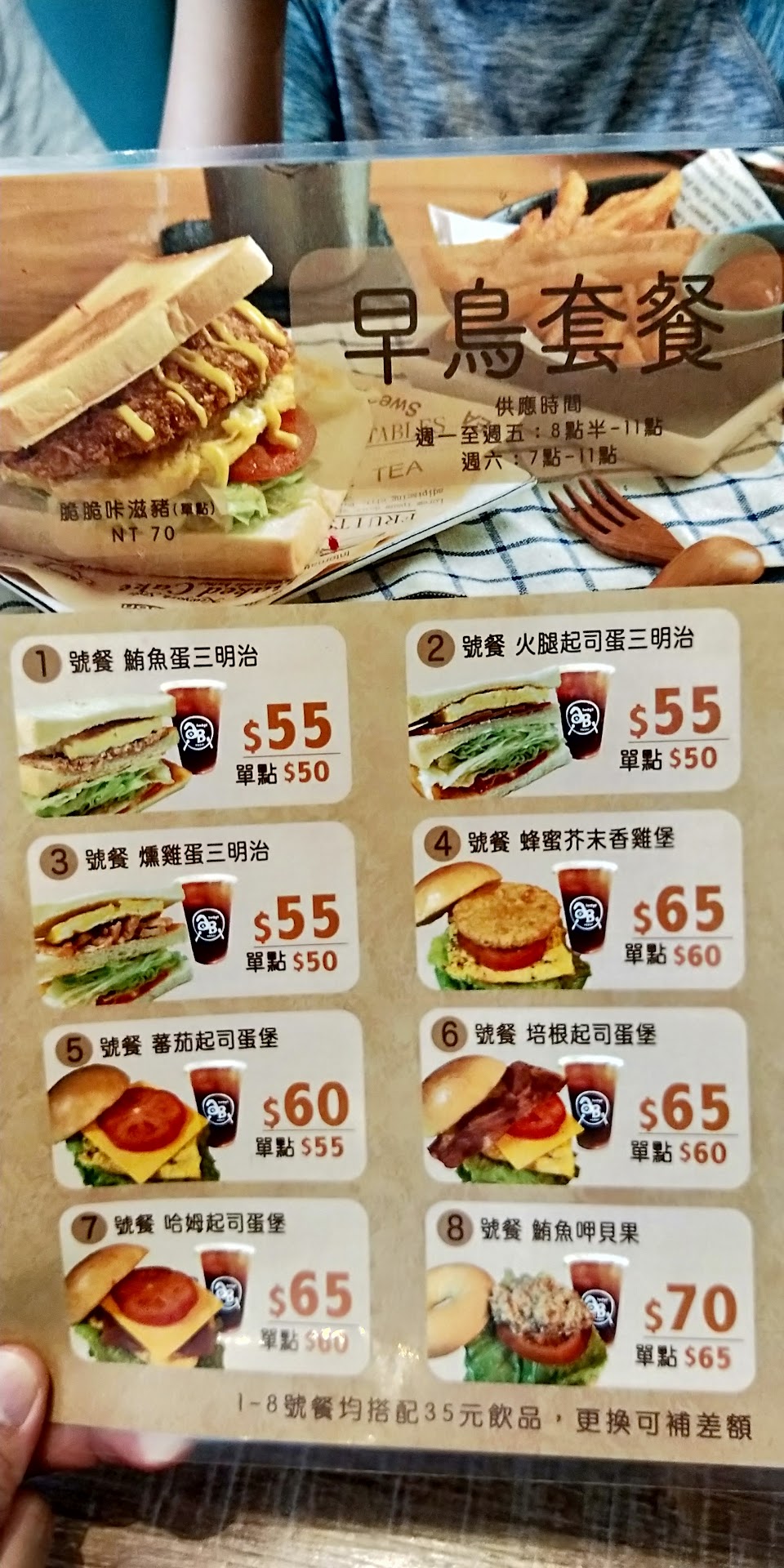 因為常吃的早午餐店過營業時間還沒開,轉頭看到這家店,門口風格清爽,窗明几淨,就走進去了。點了一桌的早餐,包括總匯更好、厚道牛堡、看老闆心情炸物跟小農鮮奶紅茶,炸物籃裡的小炸雞超級juicy, 淡淡的香草味感覺是老闆自己用心的作品;總匯裡的雞腿排也是出奇的水嫩、令人吮指回味;牛堡裡有厚煎牛漢堡跟偷藏很多蔬菜的玉子燒超合拍,雖然花生醬有點不夠味小殘念;第二杯半價的鮮奶紅茶也不錯喝,但我相信能作無糖應該更吸引我。老闆很年輕、店裏的氣氛也很不錯,整體而言是我喜歡的店。
