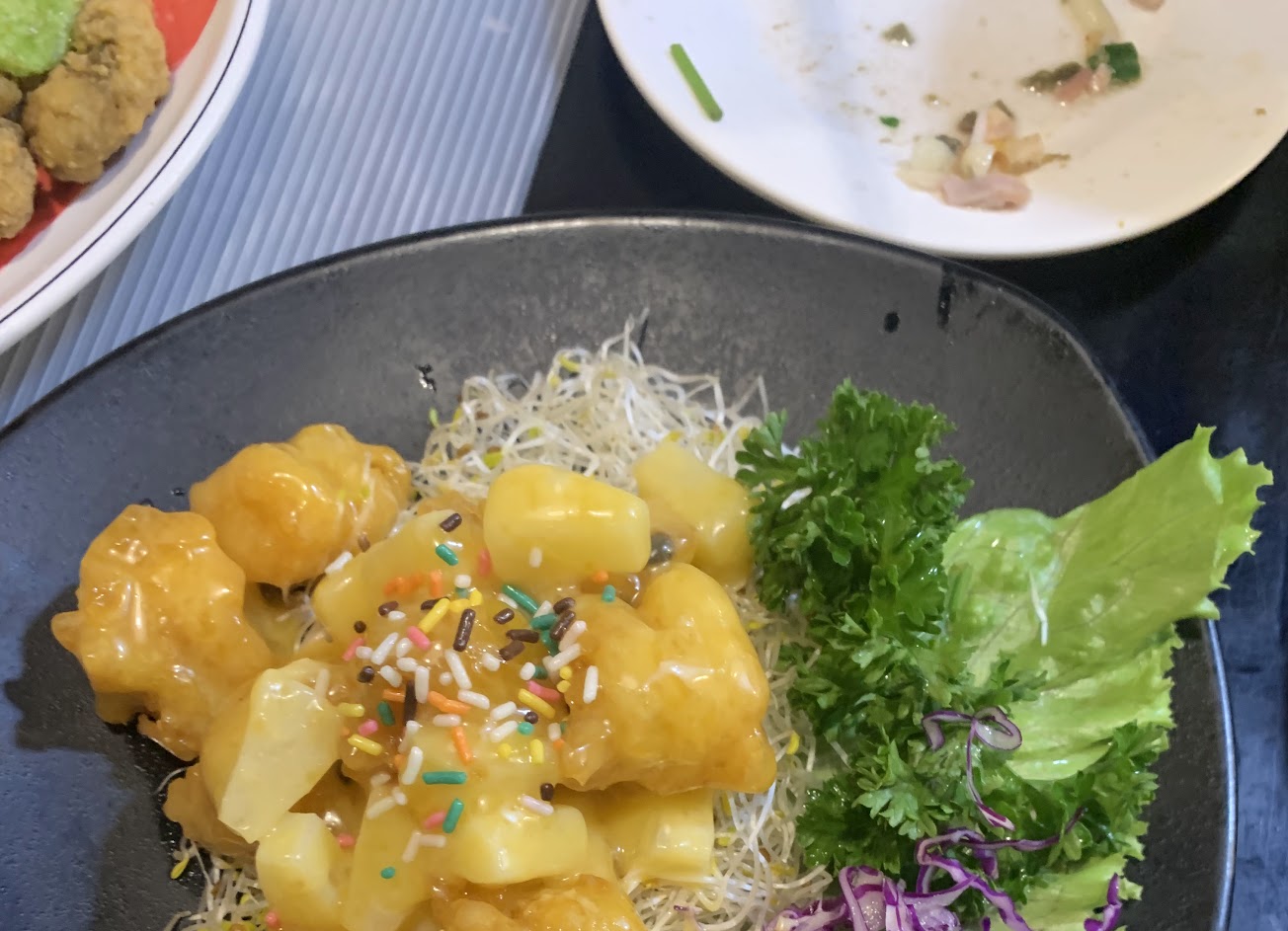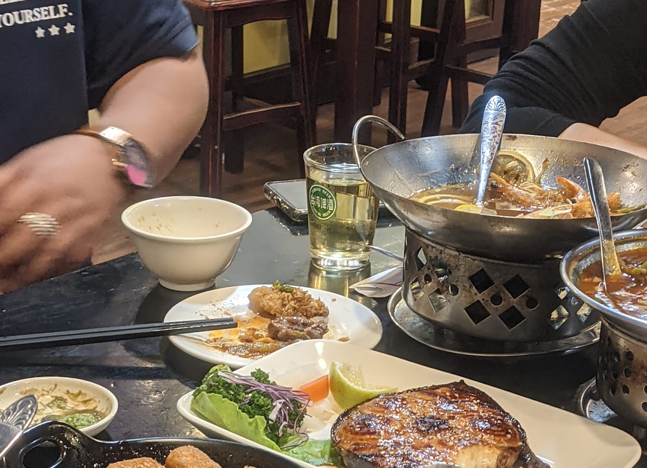 金沙豆腐蠻好吃的,會加入薯條一起炸;炒高麗菜也不錯,有快炒的味道;宮保雞丁辣度有,但不是乾的那種;店員提到烤魚有活動,吃起來還行,不過可能因為是小尾的魚,魚刺偏多要留意。
