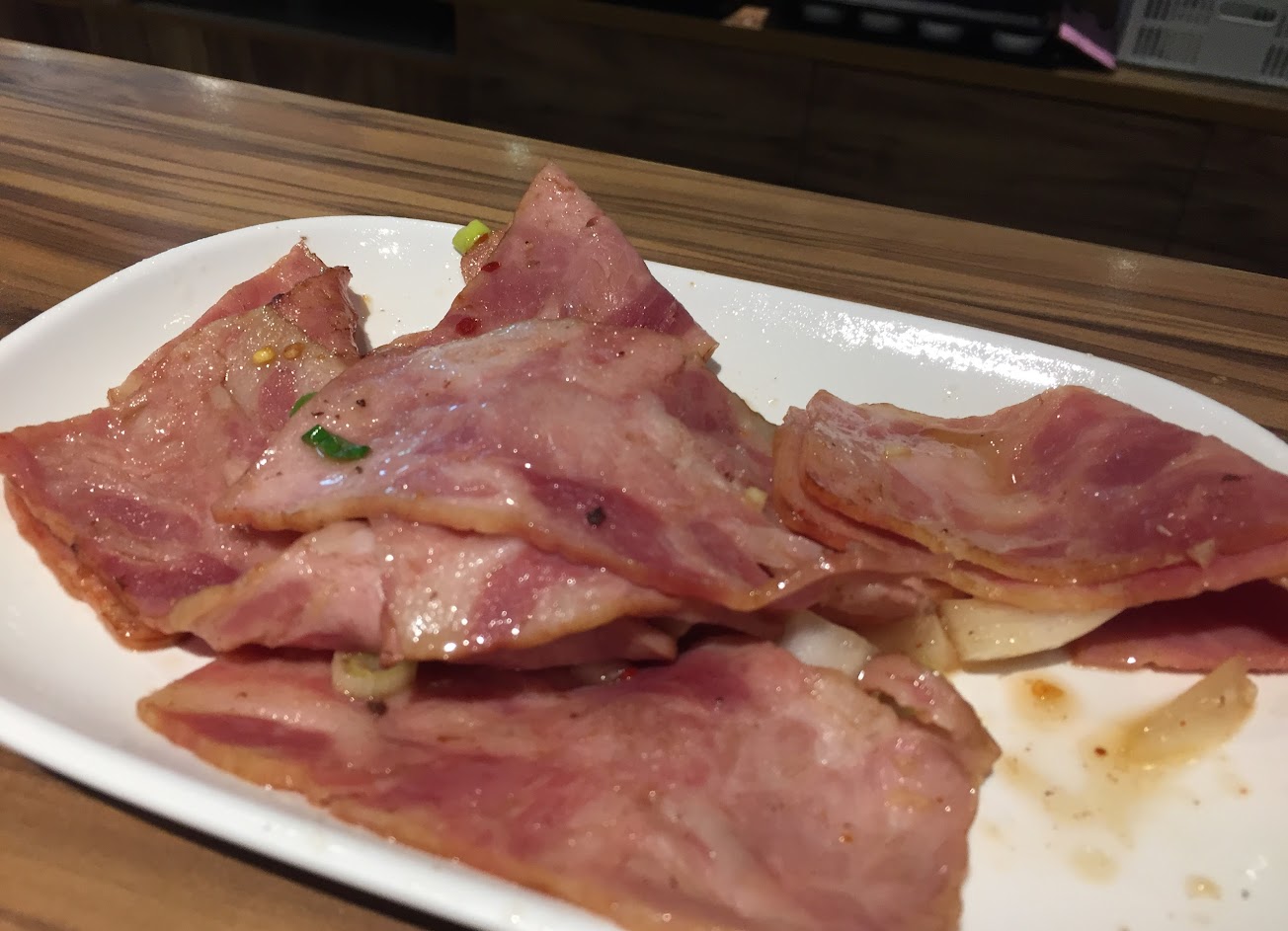 梅花豬有鍋邊炒,但覺得肉質不是很純,有點重組肉的感覺。培根豬千萬不要點,根本就是在吃早餐夾的培根片一樣,吃起來超單調,更何況要吃一盤。