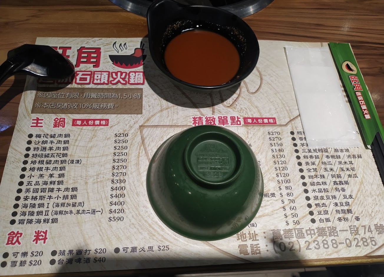 旺角來第二次了,開在中華路這裡也好幾年了! 服務人員的服務態度不錯! 點了安格斯牛小排來的卻不是牛小排部位,反應後才給正確的商品,火鍋的配菜空心菜放在最上層,是爛的、只好自己挑起,味道一般,尚可接受,石頭火鍋本身濃重的味道加入其他火鍋料顯得雜陳,好聽點叫豐富! 疫情期間,店家遵從政府規定,一律採用隔板,倒是有隱密性,還不錯!