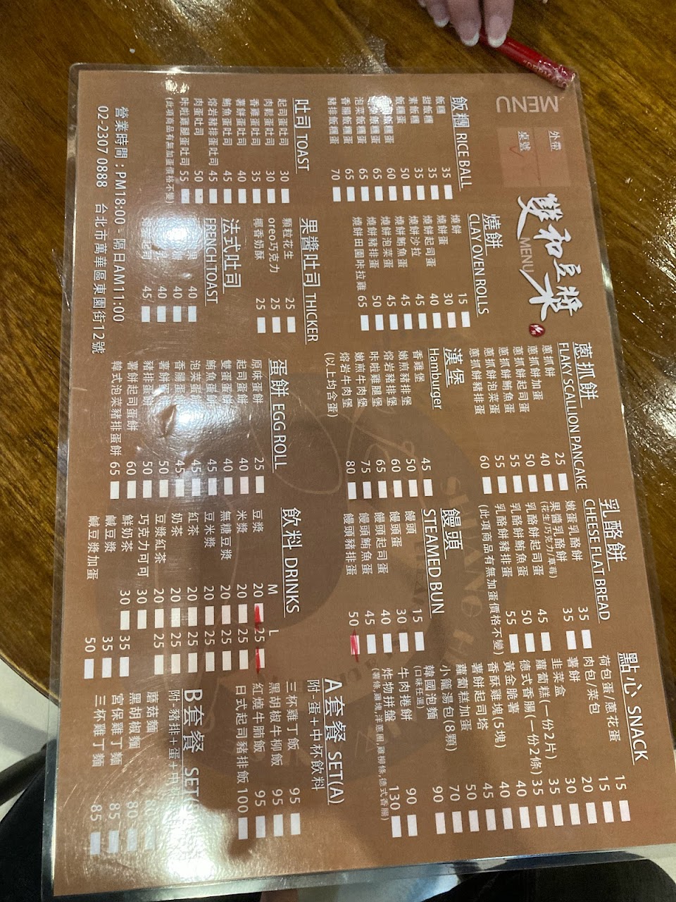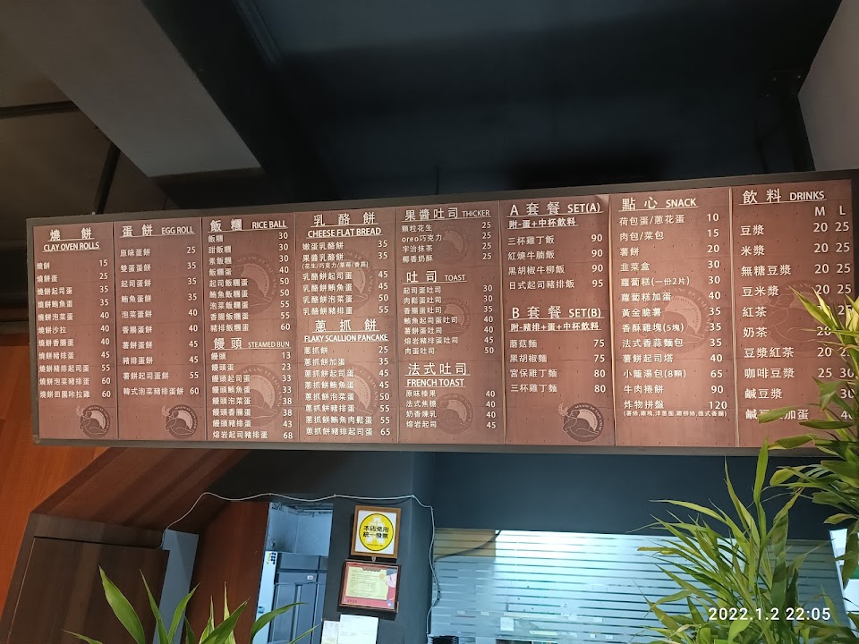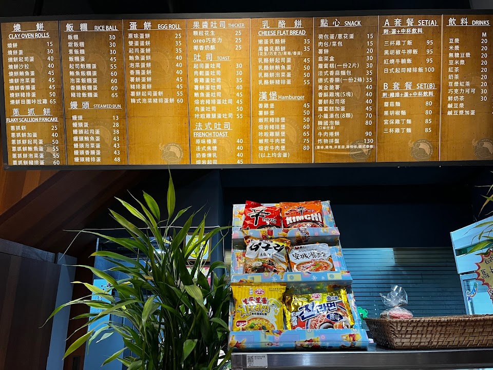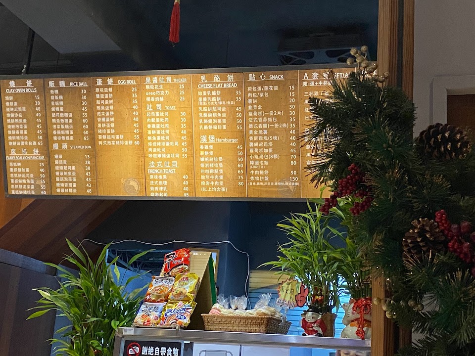但因為第一次進來,才在看有什麼餐點(看看板)老闆一直盯著(我也還沒走到櫃檯前面要點,老闆是很熱心說這邊可以點餐,我的壓力有點小大我都還沒想好吃什麼還沒仔細看就好像要我趕快點的感覺,而且我真的要點了豆漿熱的,我看他直接拿給我後面裝好的,就感覺好像不是熱的,果然是溫溫的還不是很溫?這有一點失望!(好險我有主動說內用,他才直接拿飲料給我(不然可能會直接裝袋)畢竟我第一次來不懂他們是否有內用單,當時也沒看到(後來在吃的時候東看西看的時候注意到有目錄可以看,只是放的不明顯位子,靠近廁所附近的那個角落)!