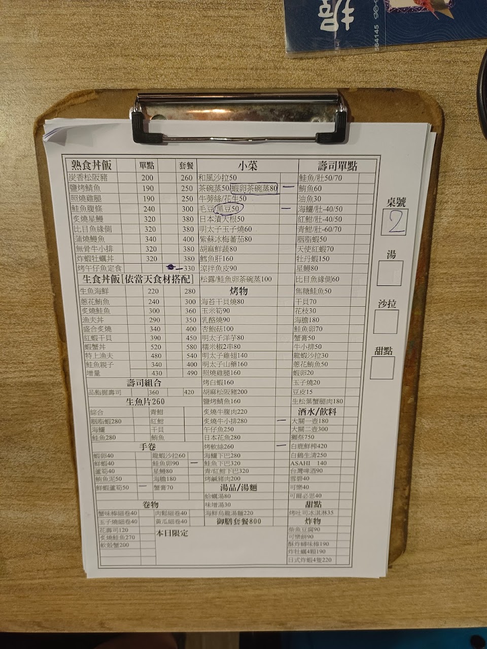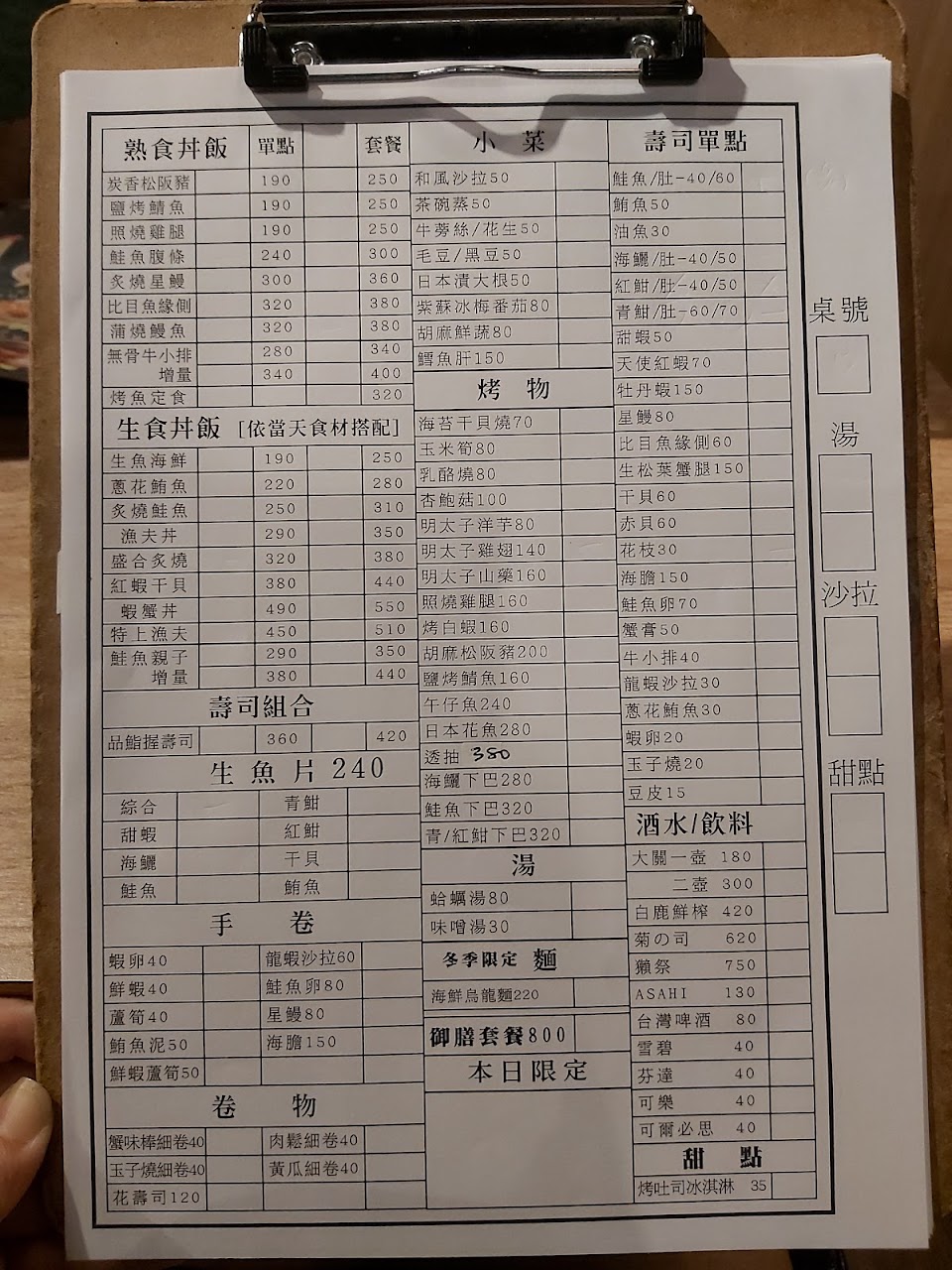 食物: 握壽司、烤物都有相當水準,吃得出魚料新鮮。 各式丼飯相當吸引人,下次回訪再做嘗試 除了菜單上的品項,另可參考黑板上手寫的因應時令食材調整的新菜單。