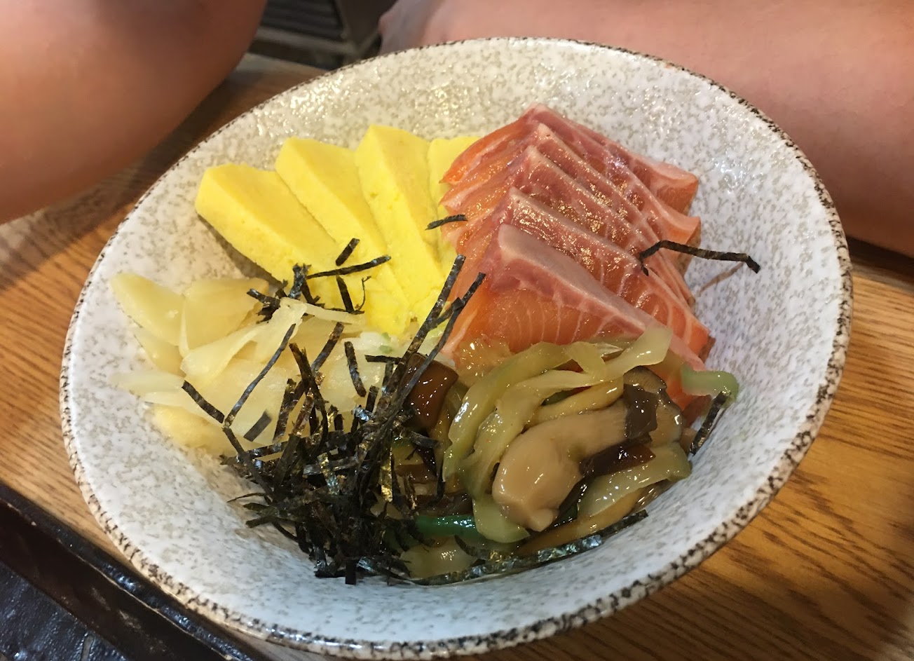 綜合握壽司只有兩種魚,6貫240元,吃到乾掉的醋飯後判定劣等。 鮭魚親子丼300元只有寥寥幾片鮭魚,大量醃漬物及玉子燒讓人不知道主角在哪 最後看影片介紹所謂秘密配方的唐揚雞口感乾柴,繼光香香雞都好吃多了