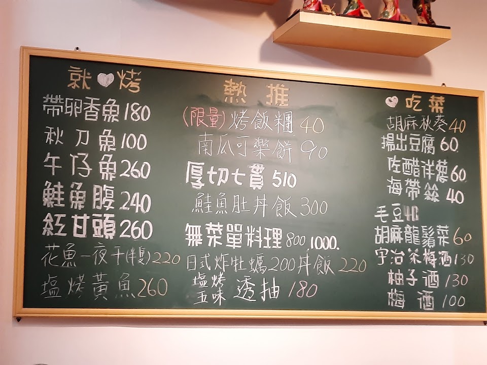 外帶餐點多次後終於有機會來內用,內用餐點的選擇自然更多了。一進店簡單裝璜,暖色調設計跟明亮燈光,有點家的溫馨感覺,座位不算多但桌椅頗舒適。菜單雖有點舊但印刷還算精美,品項也不少,當天主推菜色則列於牆上黑板,除生食外也有冷前菜,烤物和炸物,內用還提供免費麥茶跟味噌湯。