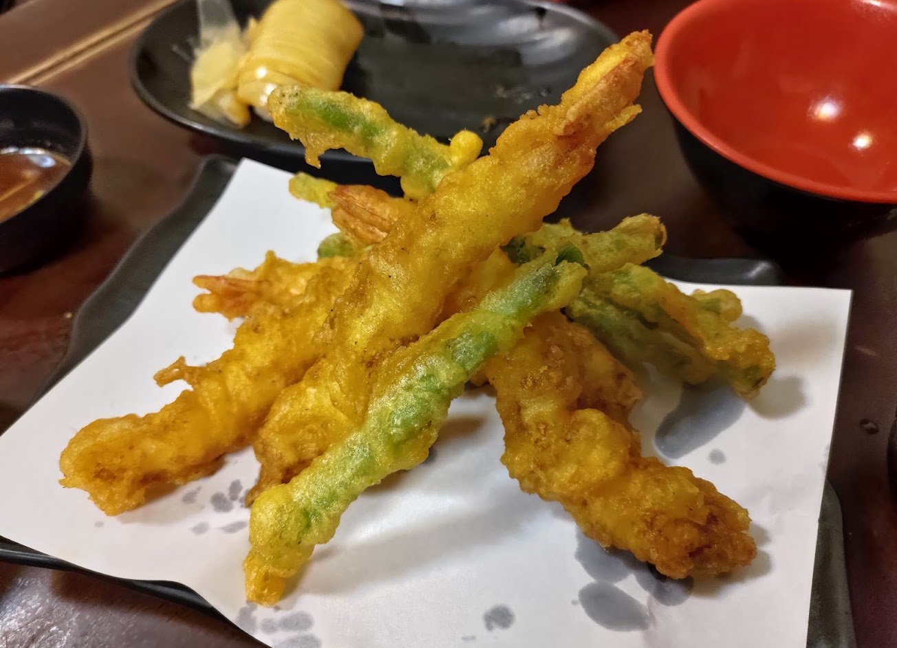 炸物也非常的好吃雖然外面裹粉蠻厚的,但是完全沒有油膩的感覺。這次吃的是炸菜天,內容有非常大片的新鮮香菇2片、還有2片地瓜,還有超級長的炸四季豆。真的讓人見識到不只是生魚片份量很大,連蔬菜這種炸物竟然也可以弄的這麼大片。