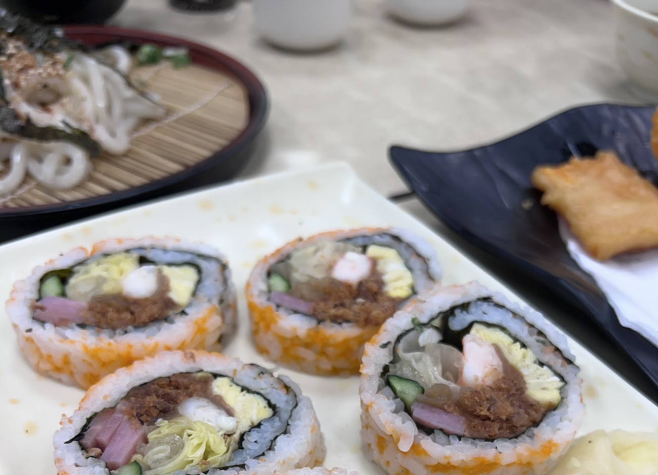 西門町的老店,是一間偏台的日式料理。 今天點了天井、鍋燒烏龍麵、烏龍冷麵、綜合握壽司和一份花壽司。 鍋燒烏龍麵和烏龍冷麵,都加了少量麻油,蠻特別的,一般日式料理都是清爽清淡,加了麻油味道偏重,雖然麵條本體很Q,但是覺得怪。 天井的炸物有蝦、地瓜、茄子、青椒,旁邊還附上一點醃的紅白蘿蔔,炸物本身就是偏油,炸的粉使用的也偏台。 花壽司感覺不是現做,蠻乾的,不好吃。 綜合握壽司,就那樣… 還附上了3碗味增湯,口味就像台式涼麵店賣的那種。 基本上是一間不怎麼樣的日本料理,不知道為什麼這麼有名。