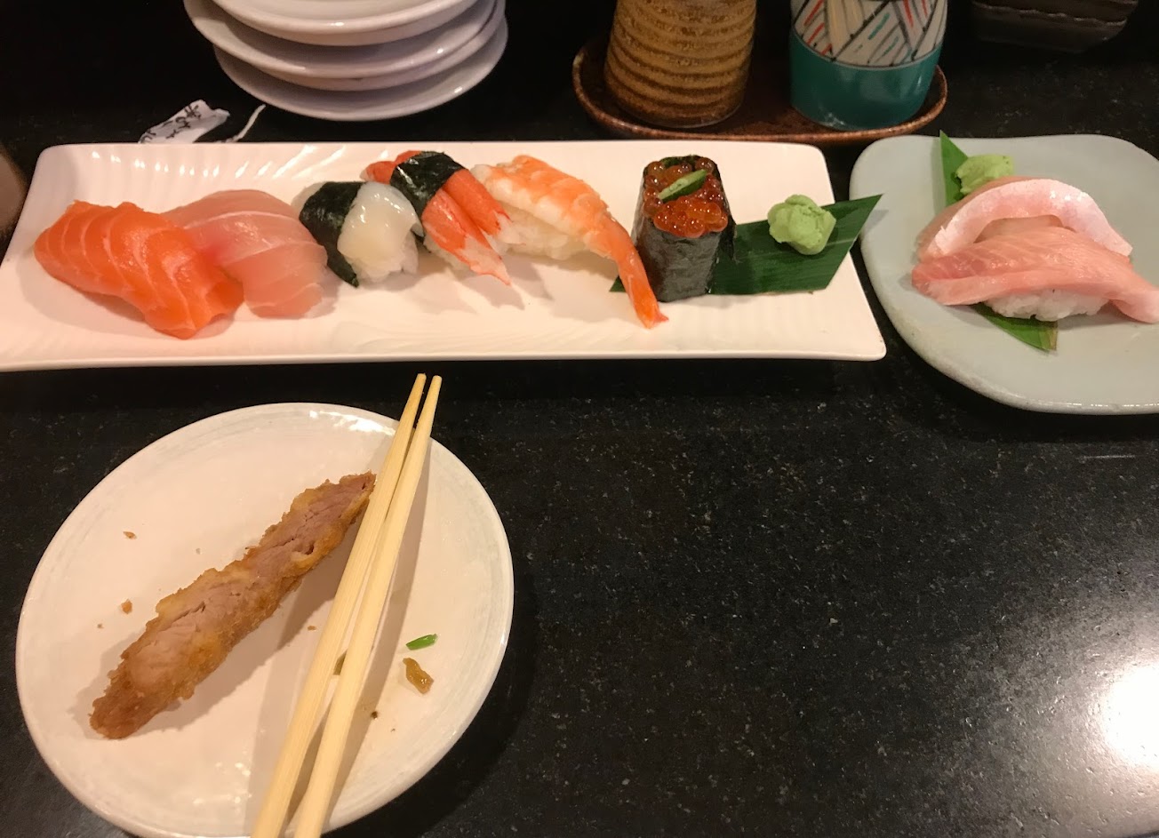 生魚片非常新鮮, 尤其是鮭魚吃起來有別家沒有的鮮甜. 握壽司的醋飯是師傅手工捏製, 不是用模子壓出來的, 雖然比不上頂級握壽司的鬆, 但是已經非常好吃. 和牛握壽司入口即化, 非常好吃, 只是要價不斐. 整體來說, 食材新鮮, 物有所值.