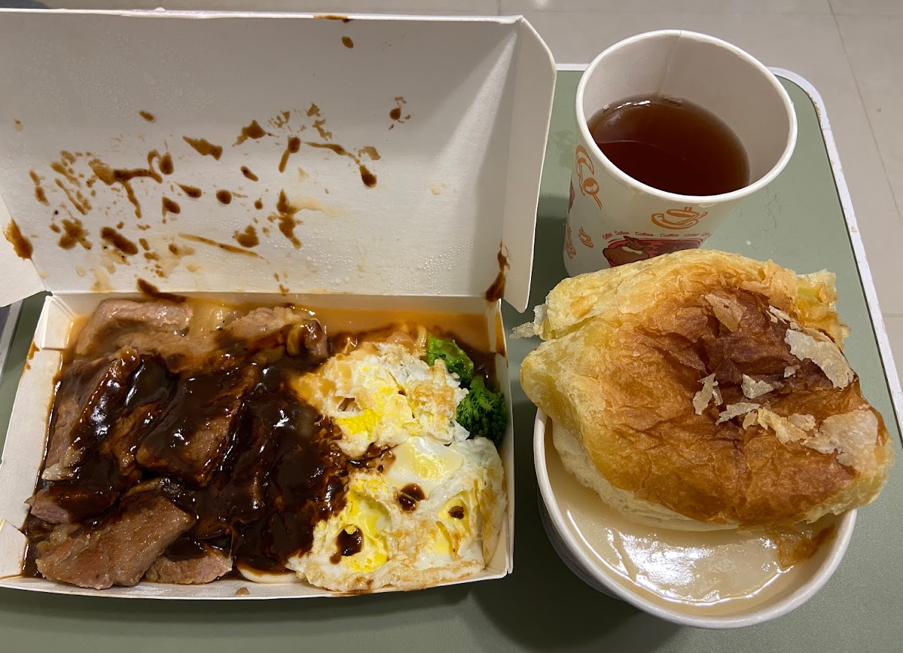 買了好幾次,都是外帶重量級牛排回家吃,包含一整個餐盒的牛排,一個餐盒裝麵、蛋跟蔬菜,一碗濃湯跟一杯紅茶,酥皮跟一個餐包,只要300圓,cp值非常高