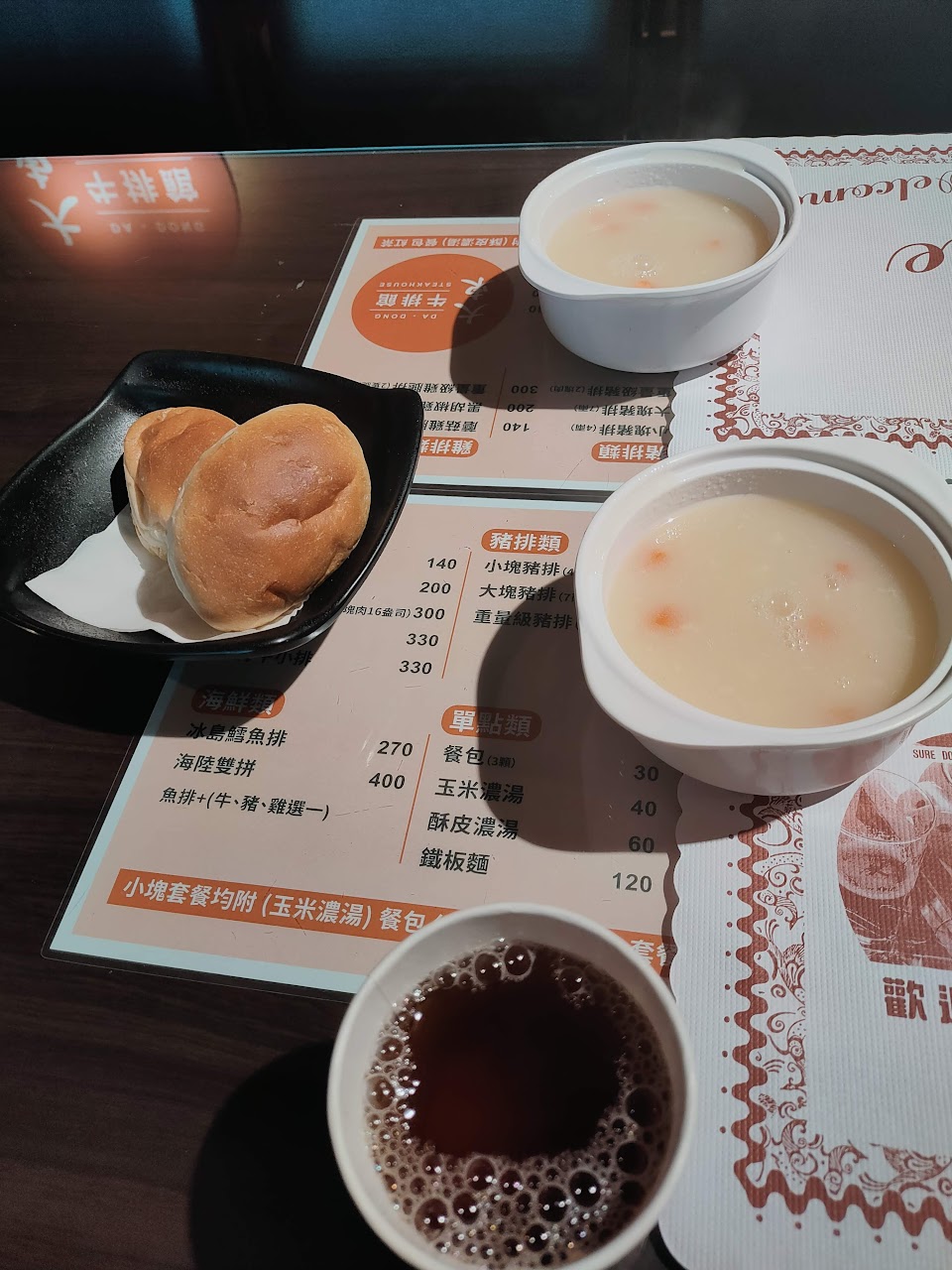 不錯的台灣牛排5/5 牛排多汁,配上醬汁很美味 附麵包屑玉米湯套餐 餐點:5 服務:5 氣氛:4