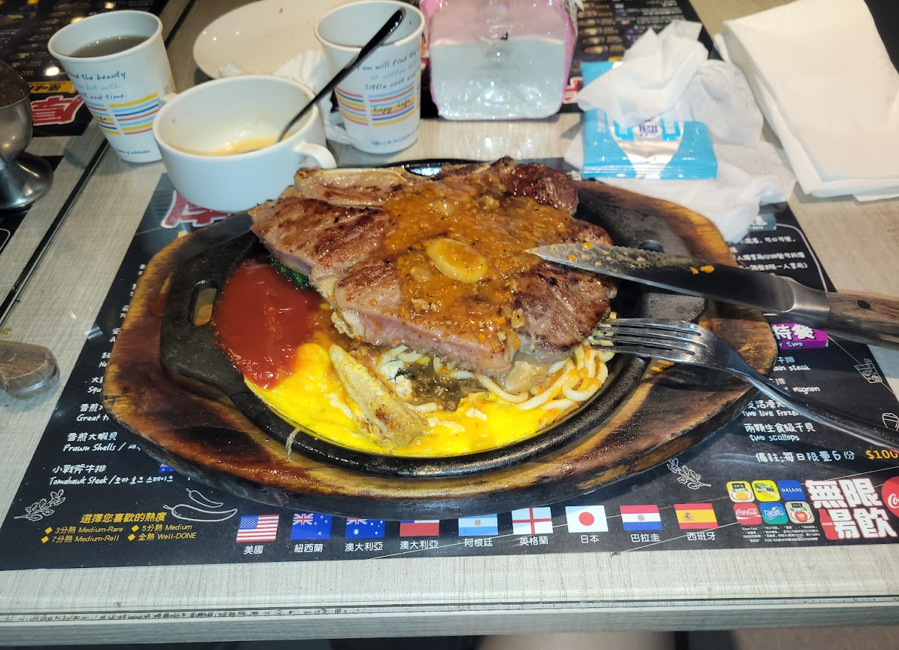 台式厚沙朗 七分熟 一開始好吃,邊吃鐵板還是加熱狀態會太熟,後面很乾很硬 如果吃比較慢的人,建議是點五分,慢慢吃到變七分 或者移動到碗裡,不要讓牛排持續變熟 不要麵,可以換菜多一點 女生12oz 有點吃不完(如果有麵的話)