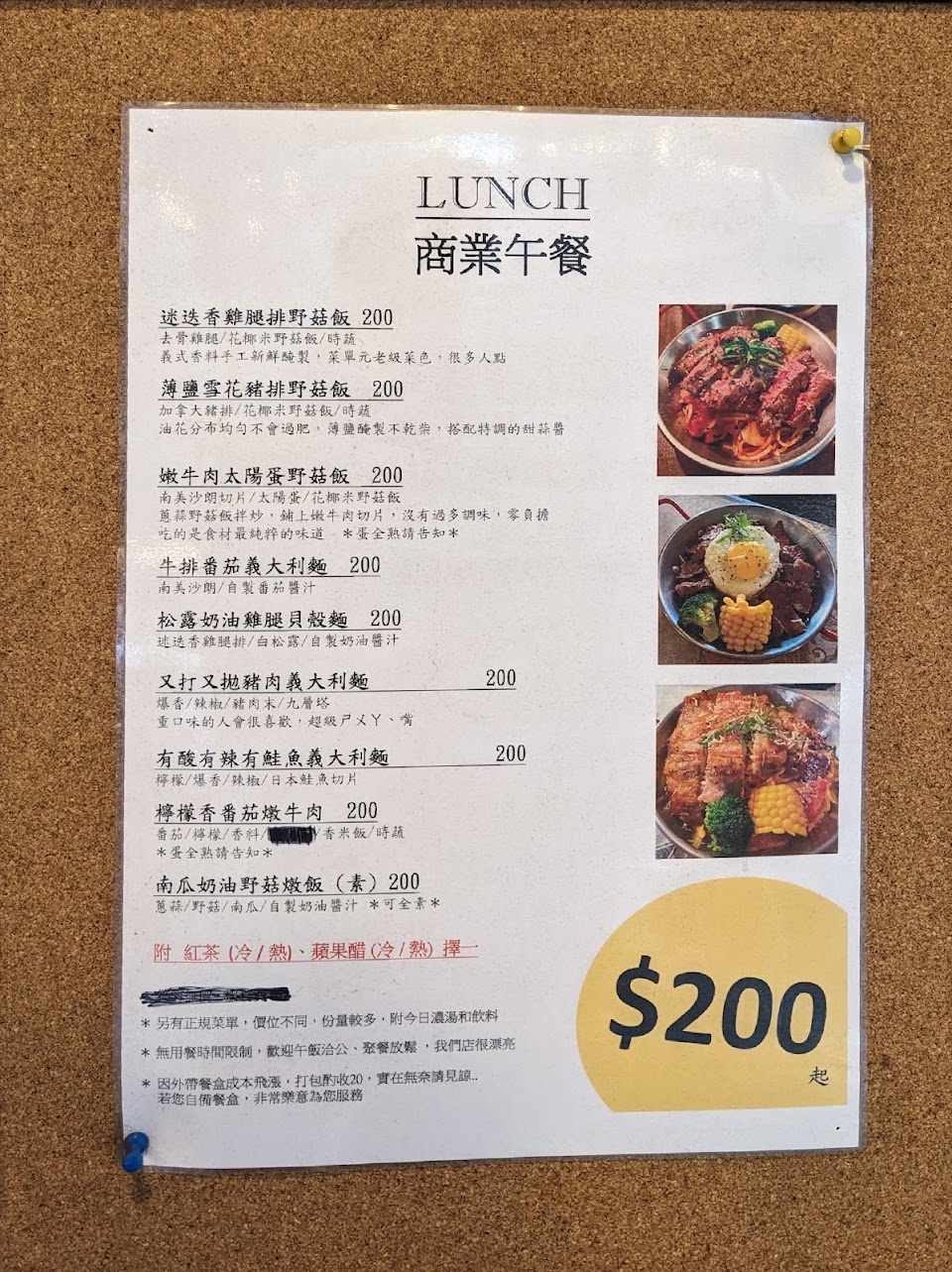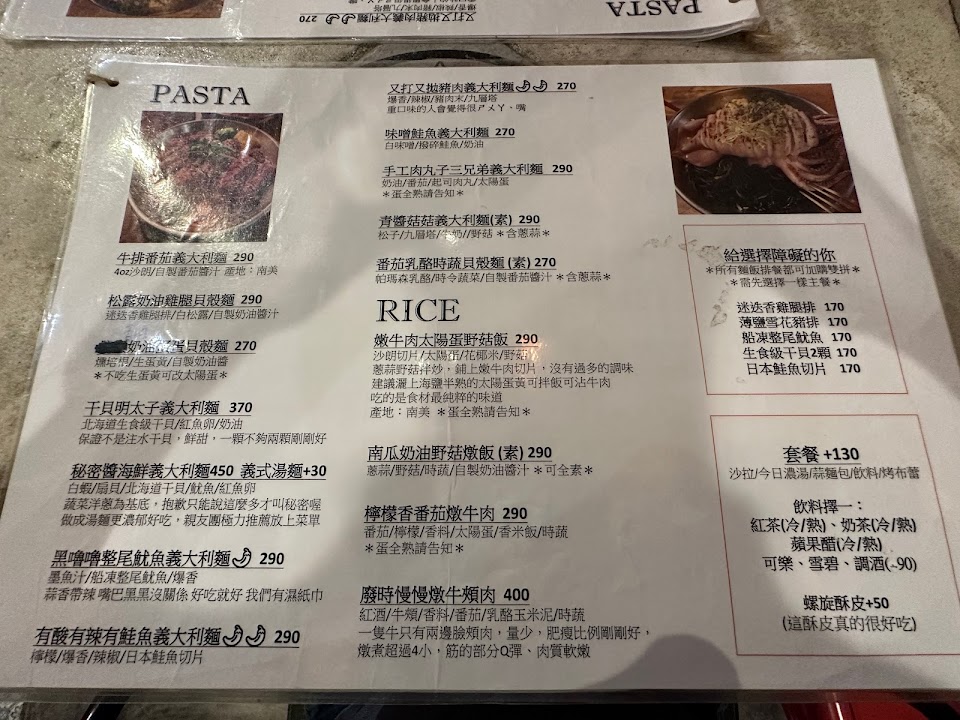 6/25因友人想吃義大利麵,二次到訪,主餐值得推薦,酥皮濃湯也不錯,但…酥皮加價有點兇,吃過黑嚕嚕、牛排蕃茄義大利麵、有酸有辣、牛肉太陽蛋菇菇飯(餐點名稱記不清只講重點),忘記拍餐點,吃完了~附餐奶茶外帶,杯底有漂浮物?我喝了啥?!