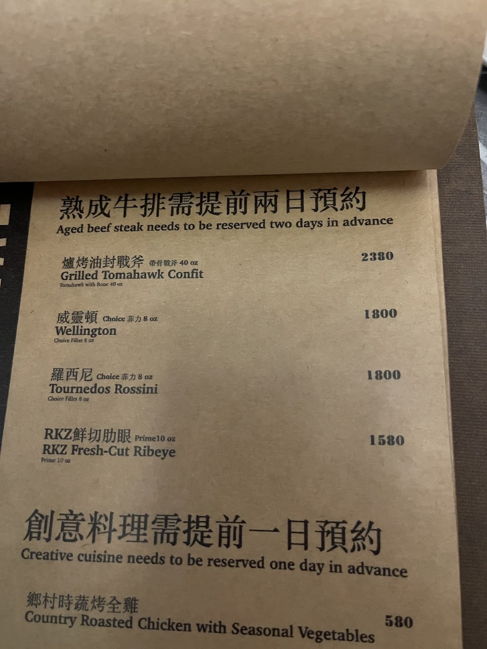 必點的威靈頓牛排,放眼整個台北沒有第二間能夠匹敵RKZ的價格與份量,味道也是相當的出色,對菲力牛排的烹調掌握爐火純青,老闆的廚藝遠遠超越鄰近餐廳的平均水準,套餐裡的厚切培根義大利麵,自製的培根外脆內嫩、油脂豐厚卻口感極佳;冰淇淋南瓜濃湯看似衝突,味道卻不會被冰淇淋的溫度影響,融進湯裡的奶味反而和濃湯產生了巧妙又協調的結合,新奇的體驗彷彿置身米淇林星級餐廳。其他以往有在菜單上、目前還沒推出的羅西尼牛排、櫻桃水果鴨胸、基輔炸雞,也是吃過一次就會常常想念,是不可多得的平價高級西餐廳。