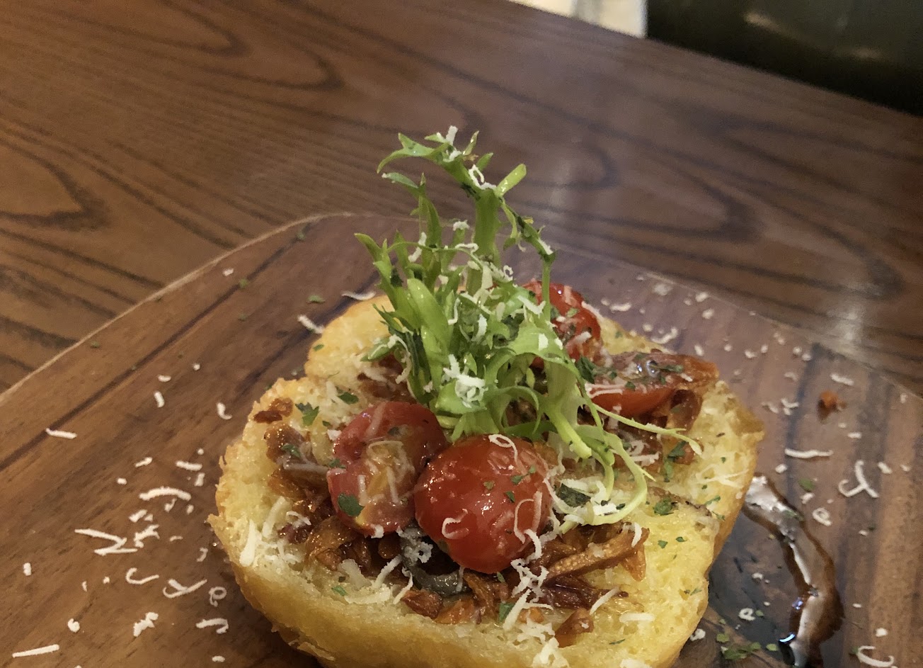 淋上他們的橄欖油之類的淋醬,麵包鬆軟外皮酥脆,並沒有因為淋醬讓麵包爛掉;上面的脆培根粒、橄欖和番茄都是各自料理過再和麵包、淋醬結合,用這個麵包開啟味蕾,真的太幸福了~